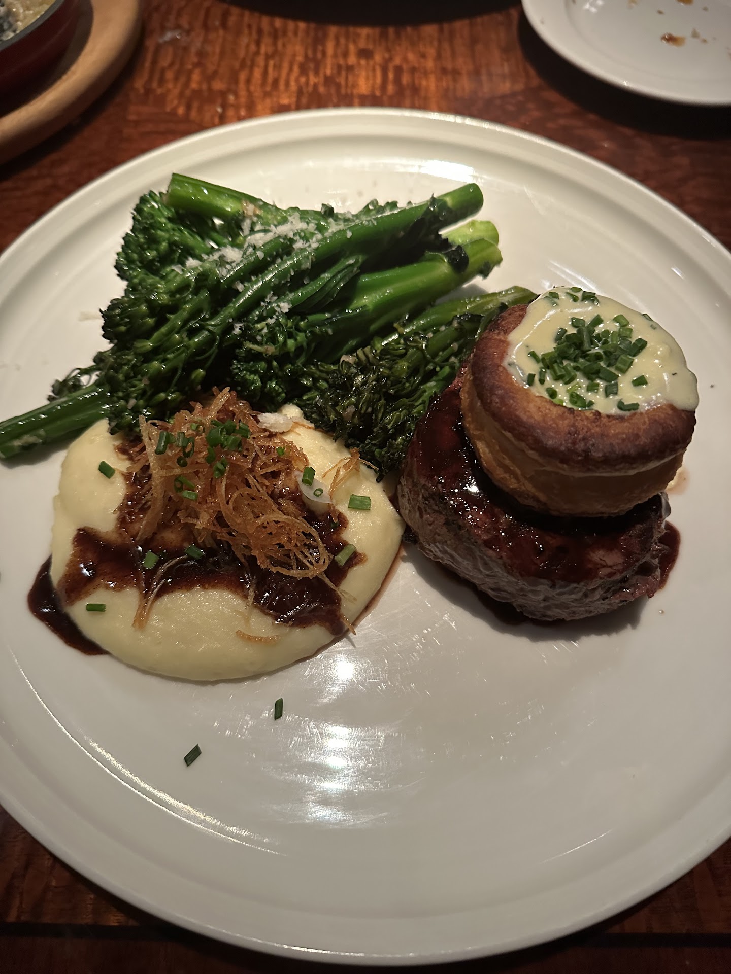 My wife had the fried chicken, this isn't your run of the mill fried chicken. The plate came with a wing, leg, thigh, and breast, the every piece was juicy and the breading was the perfect thickness, crispness, and the little honey drizzle they put over all the pieces took it up another notch, also came with creamy potatoes, and a grilled parmesean broccolini.
