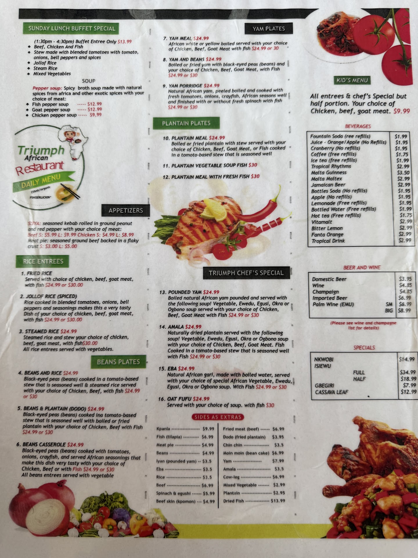 Going to leave my honest review. As a Latina who always has savory, and spicy food. I have been wanting to try African cuisine, way before tiktok made it a thing. My husband and I enjoy trying different cultures this is how we find our favorite places to eat. Sadly, I can say the food was not the best, I ordered the chicken joloff, husband ordered the beef joloff. My chicken was dry and flavorless, the rice tasted okay but lacked flavor, tasted like a boxed Mexican rice. Not a fan of plantains so I cannot comment on it however my husband liked the plantains said it was the best thing in the entire meal. His beef was tough and chewy, also had no flavor. My favorite was the spices used in the greens, the greens saved the meal but even then wasn't worth the $20 for the meal even the portions weren't worth it. I had like 4 slices of plantains not even a whole or half a plantain. Food tasted as if was pre-made and just warmed up due to the low quality of meats and the flavoring. We asked for our meal to be spicy and nothing exceptthe greens were a teeny bit spicy the meat, rice had no spicy no salt nothing. I originally went to try something (egusi soup/fufu) but I didn't see it on the menu. Best thing about our meal was the Jamaican drink ting... Prices are ridiculous, the fufu (which I didn't order because I didn't see the soup I wanted on the menu) was $20 alone so I could imagine the soup being $18-$20 for one serving plus the $20 fufu so my meal would have been 38$ for just myself going to try the other African restaurant in...