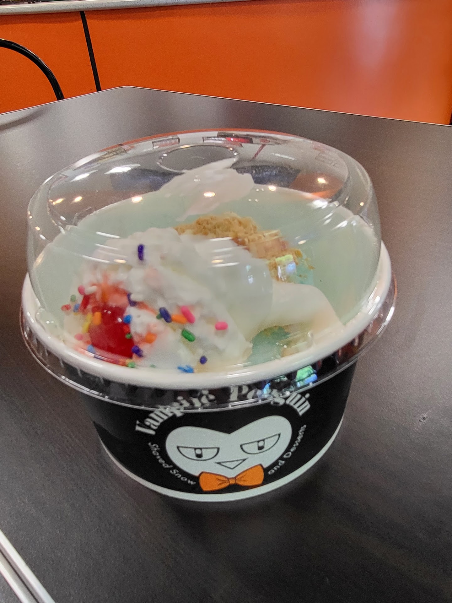 We ordered our deserts to go, and it was amazing! The snow was perfectly fluffy and light, and the flavors were delicious. The snow cones were also topped with a variety of fun toppings. Even though we ordered my snow cone to go, the presentation was still amazing and they were even served with a color-changing spoon.