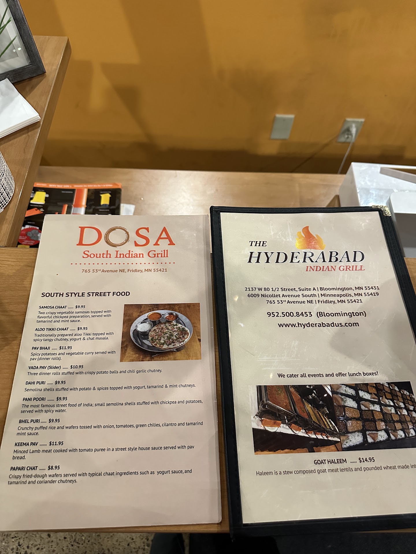 I walked in hungry as heck in a Saturday night, I was out doing my thang you know hehe.. anyways I hoped on Google and was like what's open right now. I saw all these fast food stuff and I was like naw that stuff is trash makes my stomach hurt like a mothaa** anyways I saw this place but was confused by the two restaurants they had in one spot. If you noticed it or not this place has two names the first name and most popular is called "The Hyderabad Indian Grill Fridley" while the other name is "Dosa South Indian Grill" kind of silly I know. Turns out the "Dosa South Indian Grill" is more for breakfast and appetizers while the other one is more of dinner and lunch. Yeah I know what you're thinking not a very smart business move but hey respect the owners hustle. Back to the review, so basically I order a huge as meal cause I was starving, I ordered an appetizer called Chilly chicken - Boneless cubes of chicken marinated in corn our batter, deep fried & tossed with chilly sauce & spices , and Indian Bread Peshawari Naan - Sweet Naan stuffed with nuts and raisins and baked in a tandoor, as well to top it off with my main entree and dessert. I got Dessert Gulab Jamun (4 pieces) - Deep fried milk balls in sweet syrup, and I forgot what the main entree was called I'll be honest you show up here and you're not indian you won't know what anything in the menu is besides curry haha. I just saw a picture and was like that looks like a lot of food I'll get that (see pictures). Anyways order was fast they kept it coming but only cause the place was about to close, speed will definitely vary. As I was chowing down in my grub, I noticed a lot of dashers coming in and out. I was like dang alright people know the spot for them munchies haha. It wasn't until I was just about getting stuffed one carry out person came in...that's when it happened! A Karen came in late at night demanding her order be brought with immediate haste! Haha she was rambling and even went on a hunt to look for the attendant at the front desk. She was upset that she had to wait a few minutes for her order can you believe that a few minutes the world was ending or something! She was going back and forth abouf her drink not being filled to the top etc you name it she complained about it late at night I remind you! Anyways the attendant was keeping his cool doing his thing you know haha, eventually she got her meal and rode off to the dark night. Unfortunately I was not able to conquer my main entree completely..but besides it being good the only issue I had was that I'm almost 70% sure the chicken they gave me was cooked earlier in the day and they just tossed it into the microwave for about 3-5 minutes thinking I wouldn't notice while they covered it with the rice but besides that being pretty funny the food was ight if you're really craving Indian food come here you won't be disappointed definitely not next tier but a good restaurant for a quick date night. Out of topic but as I was about to pay saw this cute Indian girl come in and I'm pretty sure she was with her man but I was about to make that move y'all and have indian everyday!!! But yeah in conclusion I give this place a badass seal of approval! (See pictures for more details of...