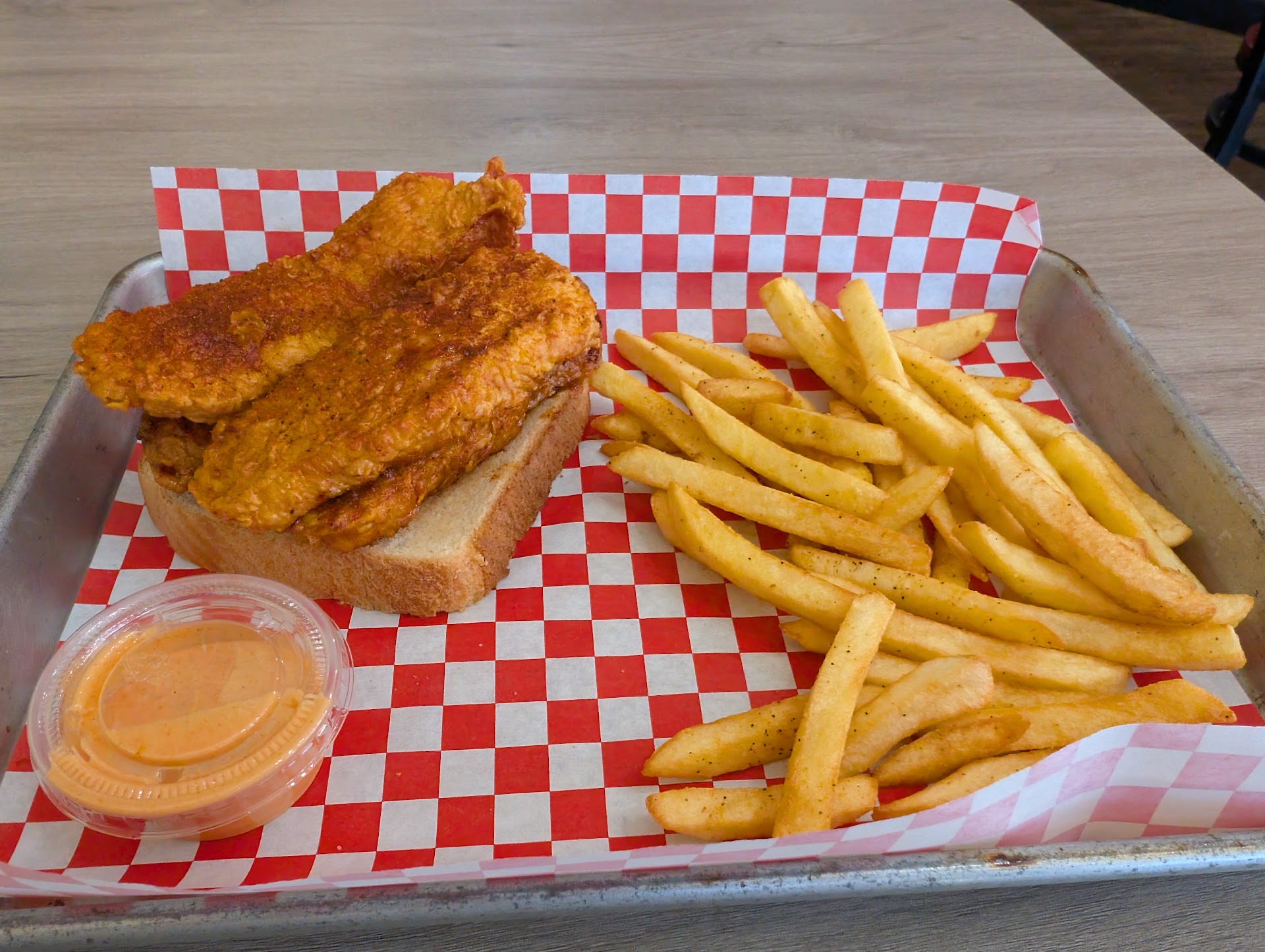 Read more"Wow!" Is all I said after I took a bite of my first chicken tender. It was fried to perfection, seasoned immaculately, and it was juicy and delicious as I bit into it. The fries are nothing special, but they are hot out of the fryer and seasoned well. The bread was thick and paired perfectly with a strip on it. The sauce that comes with the meal is a great addition that does not over power the taste of the chicken. My meal was fantastic! The atmosphere is casual and nice. The decorations and art work on the wall fit in nicely with the atmosphere they are trying to create. Some music playing would be nice, but it didn't really take away from the experience.