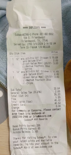 My husband and I went to Subway yesterday to get the meal of the day because we didn't want to pay an arm and a leg elsewhere for lunch. We ordered the foot longs for an additional $3 so we would have leftovers for lunch the next day. I checked the app and the menu board, and it was cheese steak. Great! We asked for the meal of the day and she proceeded to make the BMT. We pointed out that it was the cheese steak and she ignored us until I insisted. She glanced back at the menu board, grunted and started changing the meat. My husband and I gave her grace and chuckled about how it's easy for days to blend together, even after she kept confusing our subs, as we had different bread. It was somewhat frustrating but people have bad days, so we were fine with it. I get to the counter to pay, and it's $24 and some change. It seemed a little high, but I paid, we got our drinks and chips and sat down. Then I thought about it, figured up tax, and it should only have been around $21.50. So I went up to the front and said, I think you overcharged us. No big deal. My receipt was still sitting on the printer. She never gave it to me. She had charged us $11.99 each for two foot longs. So we went back and forth, me saying she changed us wrong, and her saying she charged us for two for longs and gave us the chips for free. WHAT? So then she starts slamming things around and started treating me like I was being petty over $2. (And lady it was actually $4, but she had gas lighted me to the point I just stared at her. She basically tells me to go sit down and she'll bring me my $2. I go sit down, no longer hungry. She brings me the $2 with this fake, "I hope your enjoy your meals." We will never ever ever return to this Subway. If we wanted to spend more than $20, we would have gone somewhere else. I guess you get what...