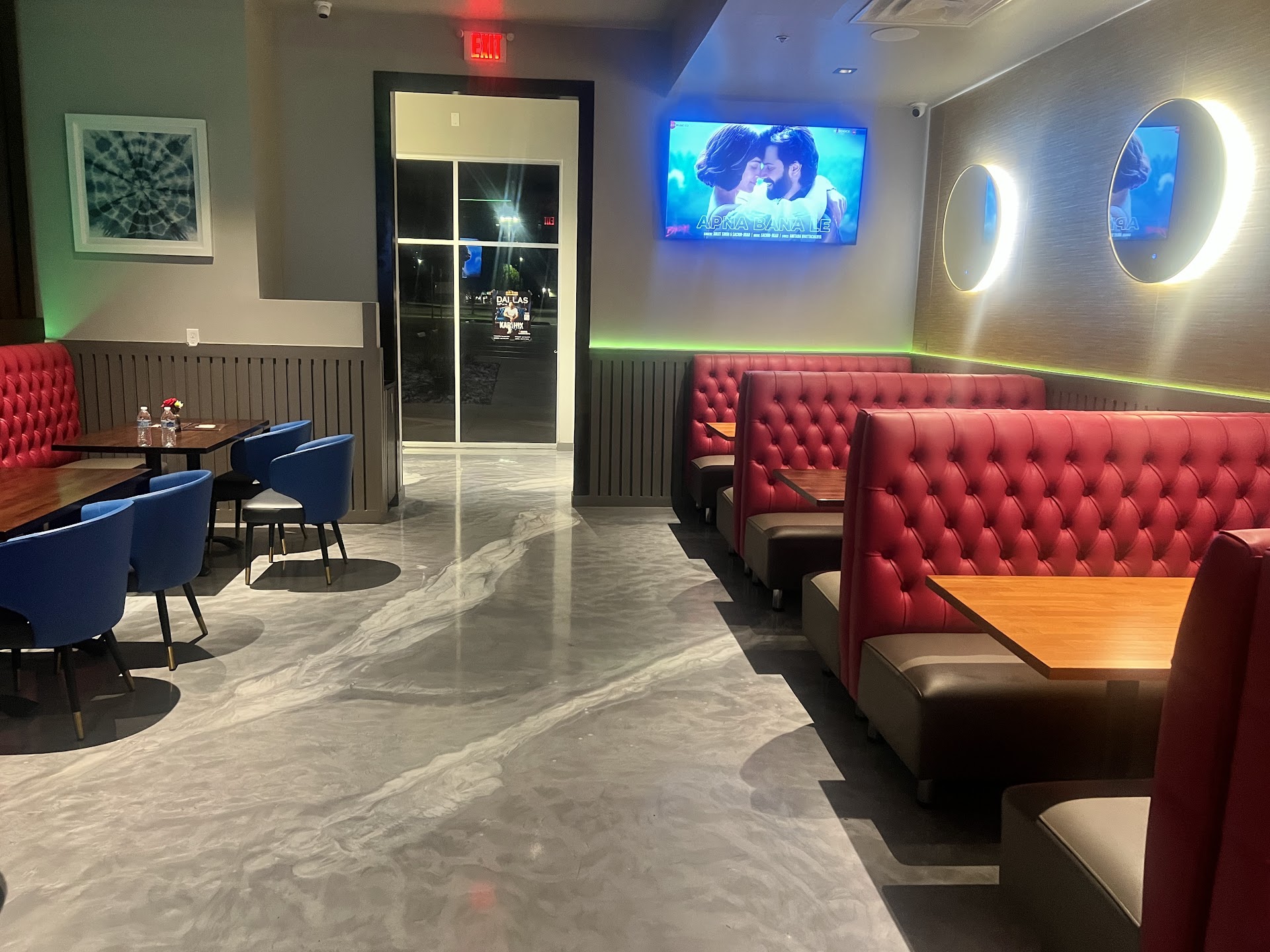 Read morePros: +well decorated, 4 booths and 2-4 tables dine-in area, with mild Bollywood music & 2 TVs, mild lighting: you can hear and also talk, see but feel private enough +adequate portion sizesâespecially of rice +tasty IF you like spicy food or perfumed rice +one friend enjoyed a boneless goat biryani dish +tasty naan!