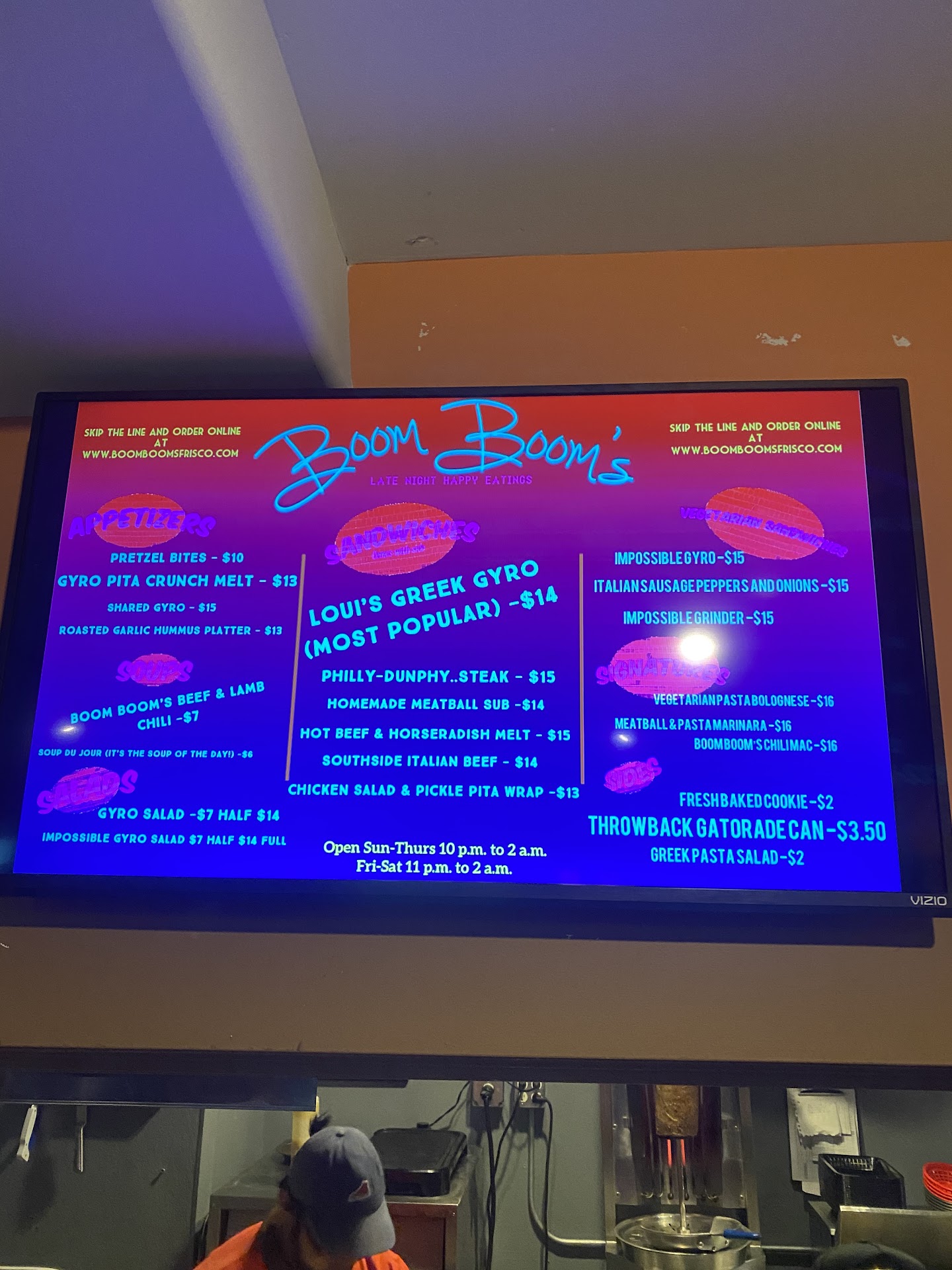 When driving down I 70 late at night and your face with the same old greasy food chain options like Wac Donald’s and Taco hell you never expect to find a hole in the wall eatery that is preparing and serving food with integrity and passion along with it side of friendly banter but that’s exactly what you’ll find at Boom Boom Late night eating does . The owner operator kindly offered up some tasty bites like crispy succulent gyro bits off the spit and a homemade meatball while I waited for my order. While we spoke about his upbringing from a Romanian and Greek parents in Chicago he whipped up some homemade Greek pasta salad and an authentic Chicago hot beef sandwich with a cup of broth dip. Both were beyond my expectations; super fresh and full of flavor . Definitely give this place a try next time you’re in the neighborhood or just passing Frisco on I 70 at 11 PM...