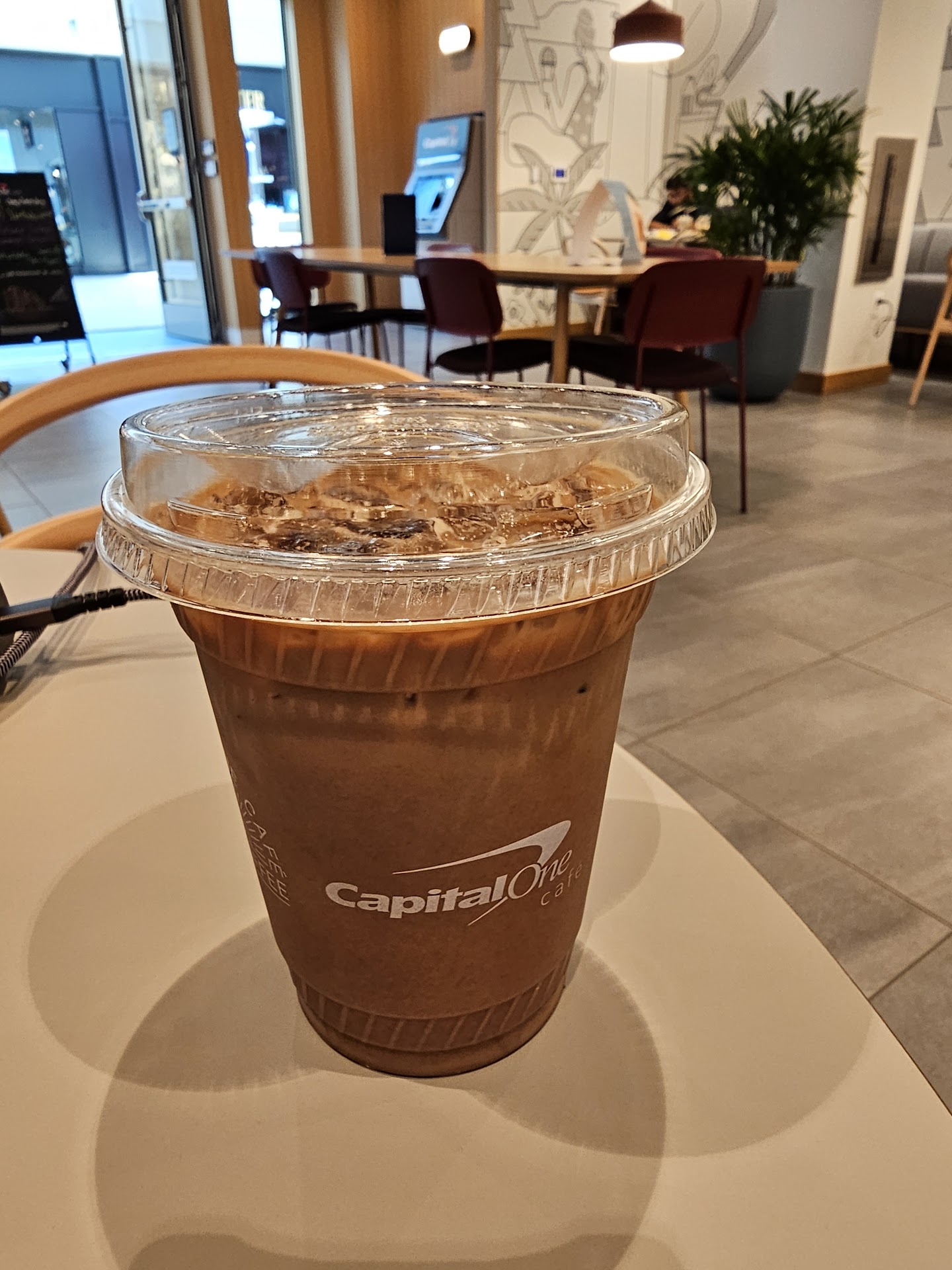 This is a pretty innovative promotion for Capital One. This Café features coffee by Verve Coffee Roasters, which if you didn't know is quite popular in LA (look them up). It's good coffee. If you have credit or debit card that matches the name of the establishment, you can get your stuff at a discount - at the time of this review it's 50% off. They also have some other promotions at the time of this review (June 2025)- on Mondays members can score a free drink, and on Fridays certain drinks are $3.60 for members and non-members alike. Of course they have information (advertisements) on the walls, asking you to sign up for their bank, but it's no everywhere - they aren't printing it on the coffee cups or anything.