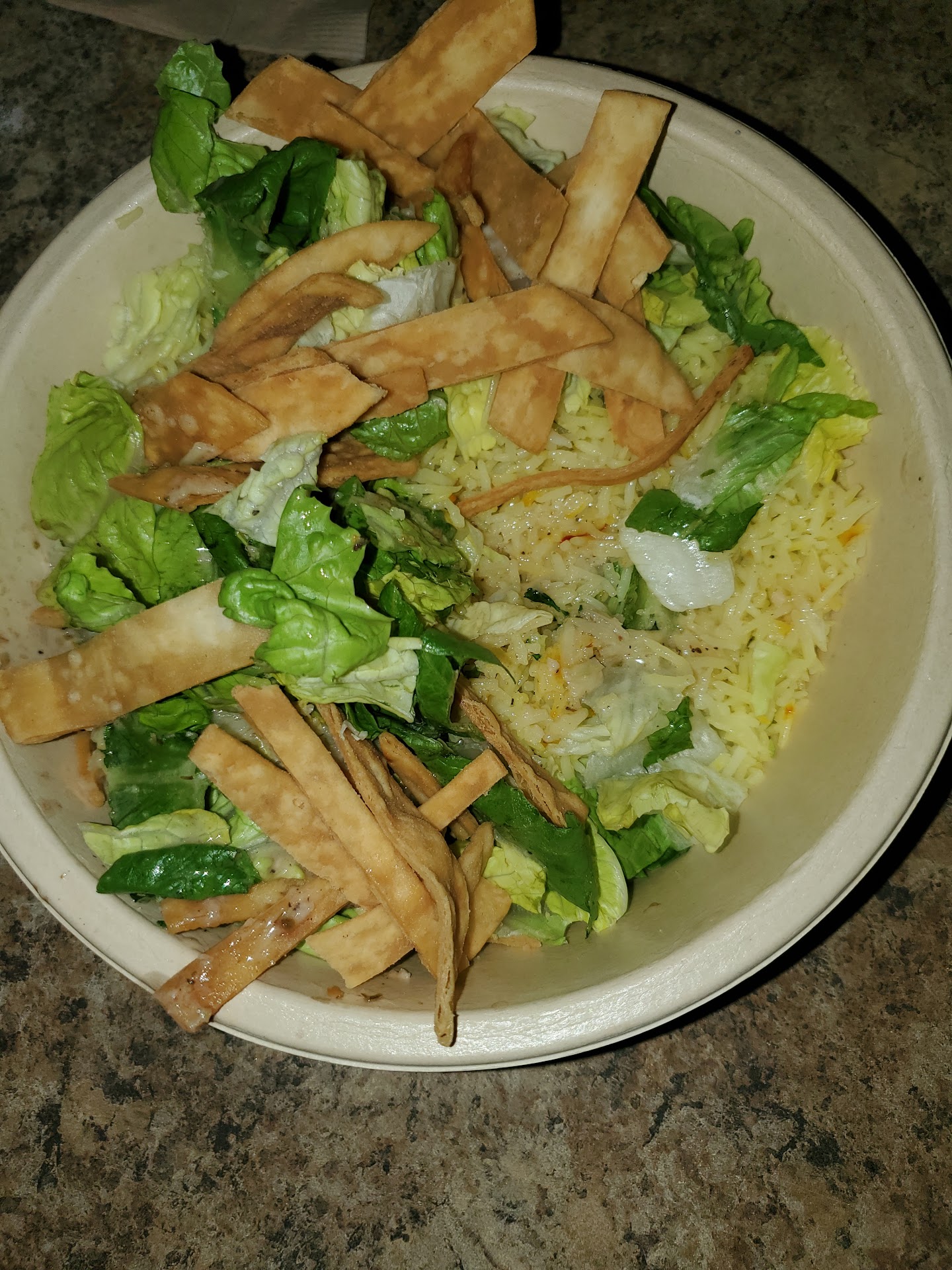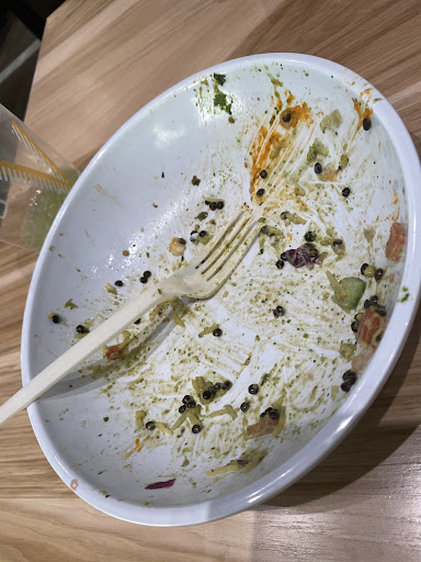 I go home and start prepping my own corn to put in the bowl since they didn't have any. I take out the bowl out of the bag and notice it's looking a little...empty. I open it it and poke around and they DIDN'T PUT ANY MEAT ON THERE. What?! How do you forget that? It was literally rice, lettuce and chips. There was sauce on there, but barely.