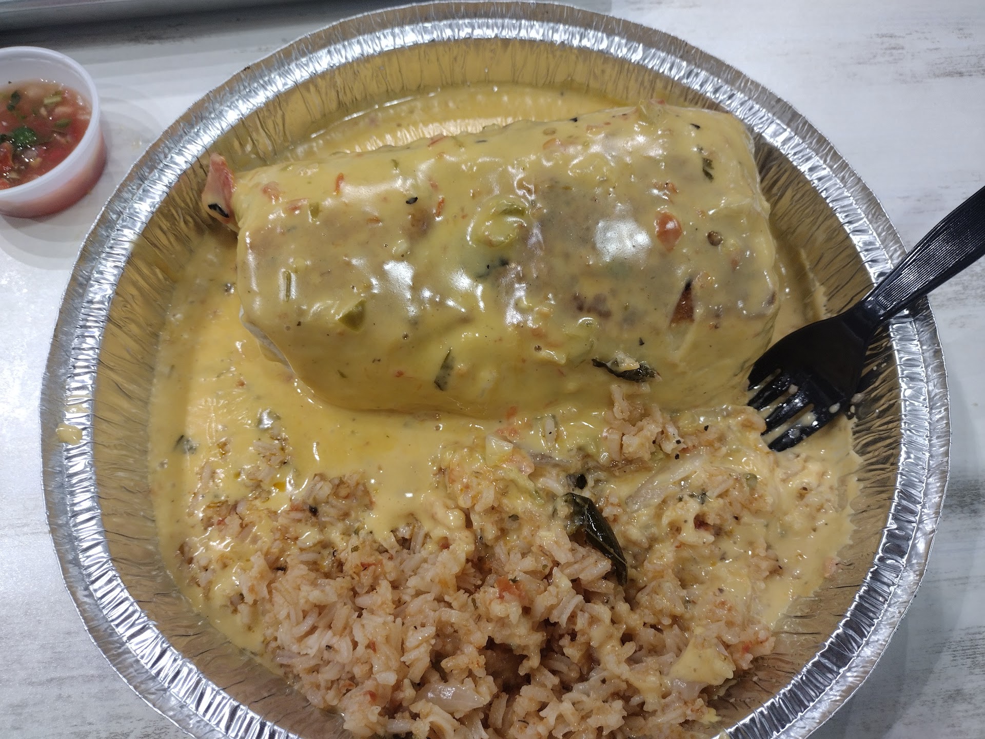Our food arrived hot and tasted ok so I didn't complain about the tacos. I just took the fish off the tacos and ate it. My husband's burrito had some sort of Chipotle pepper sauce instead of the queso. He said the steak was flavorless. He ate it because he hates sending food back and he was really hungry also.