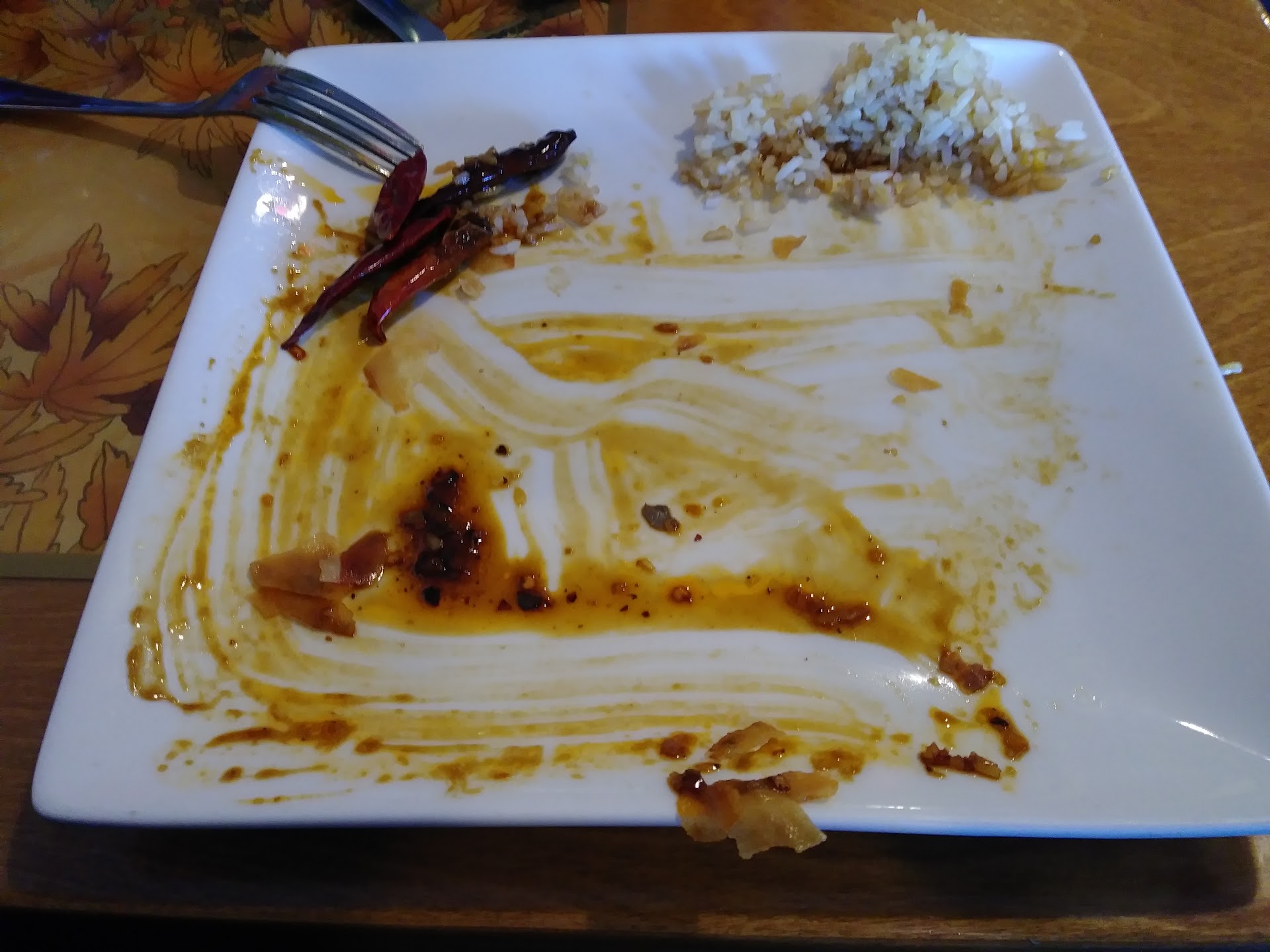 Someone came to greet us and take our drink order almost immediately. We ordered hot tea, with spring rolls, dumplings, and crab rangoon for appetizers. For our entrees, I had Szechuan beef extra extra spicy, and he had General Tso's chicken. Both came with lightly fried rice.