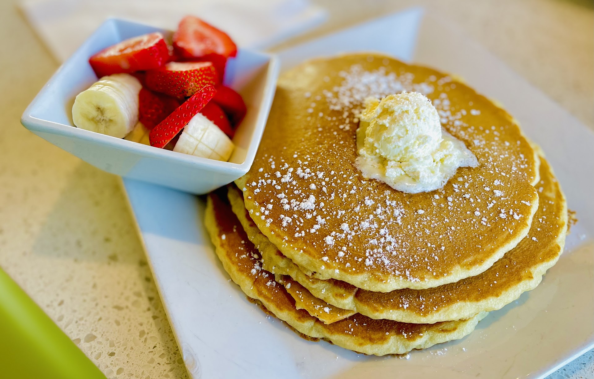 Our server Heidi was very kind and sweet and had our hot tea ready in five minutes and food to the table in under 15 minutes. Mom ordered the Chicken Florentine Crepe with a side of Hollandaise sauce and I ordered the stack of 3 Buttermilk Pancakes with a side of Bananas and Strawberries (which we both had to box up to take home). Also shared an order of home fries which were hot, perfectly seasoned and crispy, and perfect for two to share. All excellent! Arrived at the table hot off the griddle and perfectly cooked with that signature traditional flavor. We will be returning to try one of the...
