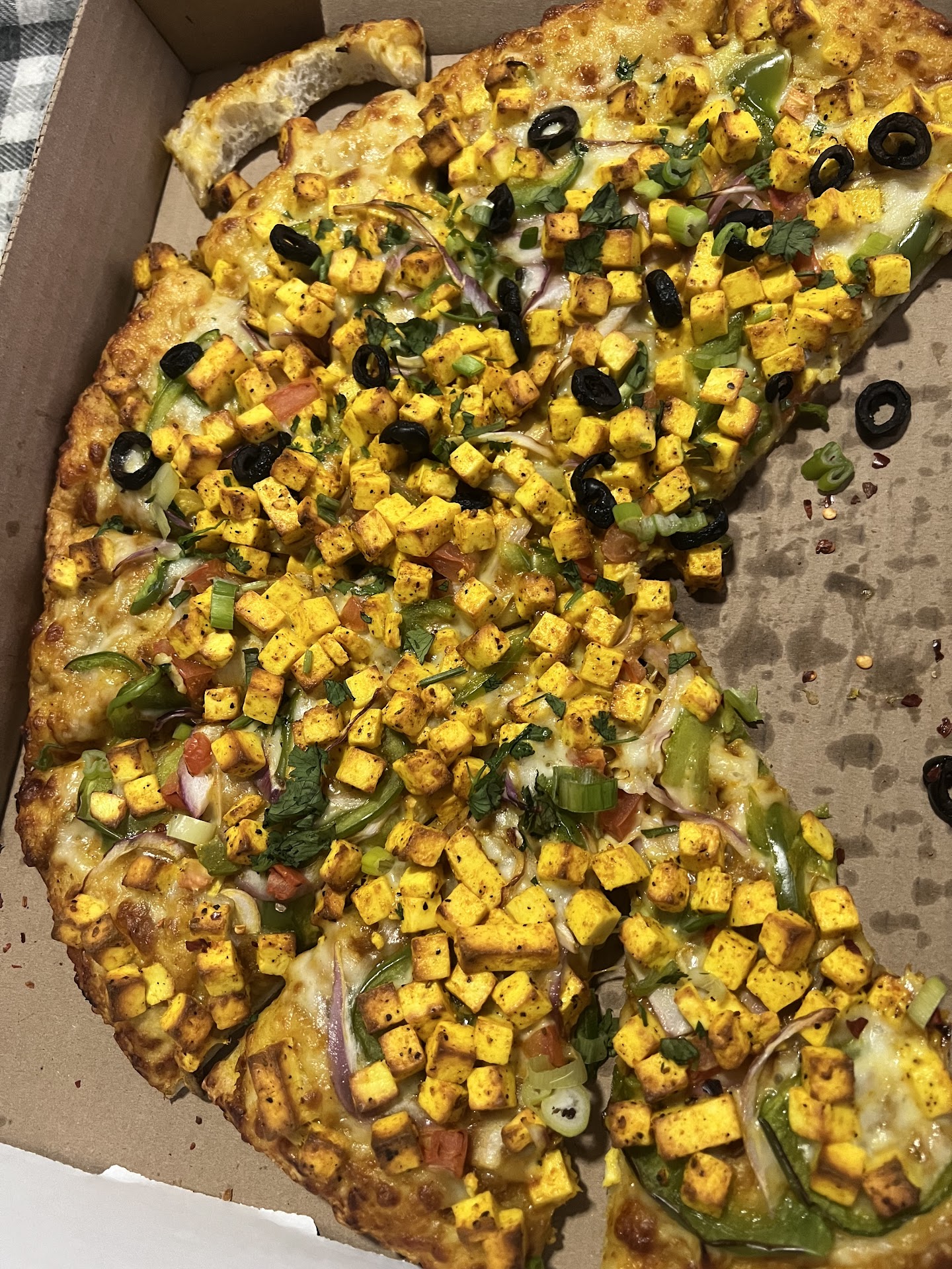 We have recently moved to Texas and came across this Indian Pizza place. I was really skeptical since the prices were extremely high compared to other popular pizzas but we still went ahead and ordered for a large half and half- Shahi paneer, Chilly paneer pizza and garlic sticks with cheese which costed us a whopping amount of $40. Firstly, the garlic sticks with cheese is just plain cheese pizza without any flavor, forget about the garlic alone. Secondly, we did not know what’s the difference between with the 2 pizza flavors.. my taste buds literally couldn’t tell what the difference is. From the photo.. we can figure out that one side has olives and the other side has tomatoes as extras. Trust me that’s the only visual difference. Coming to the most important thing, the taste.. it’s extremely plain, the paneer I’m sure was just sautéed with salt and turmeric and put on. I don’t even want to talk about the cheese as it was missing completely! Thanks to my husband who put salt, tandoori Masala and chat masala on the top of it to make it a little appetizing. We would never come back to this place until the management/ chefs look into this and come back with good quality tasty pizzas with...