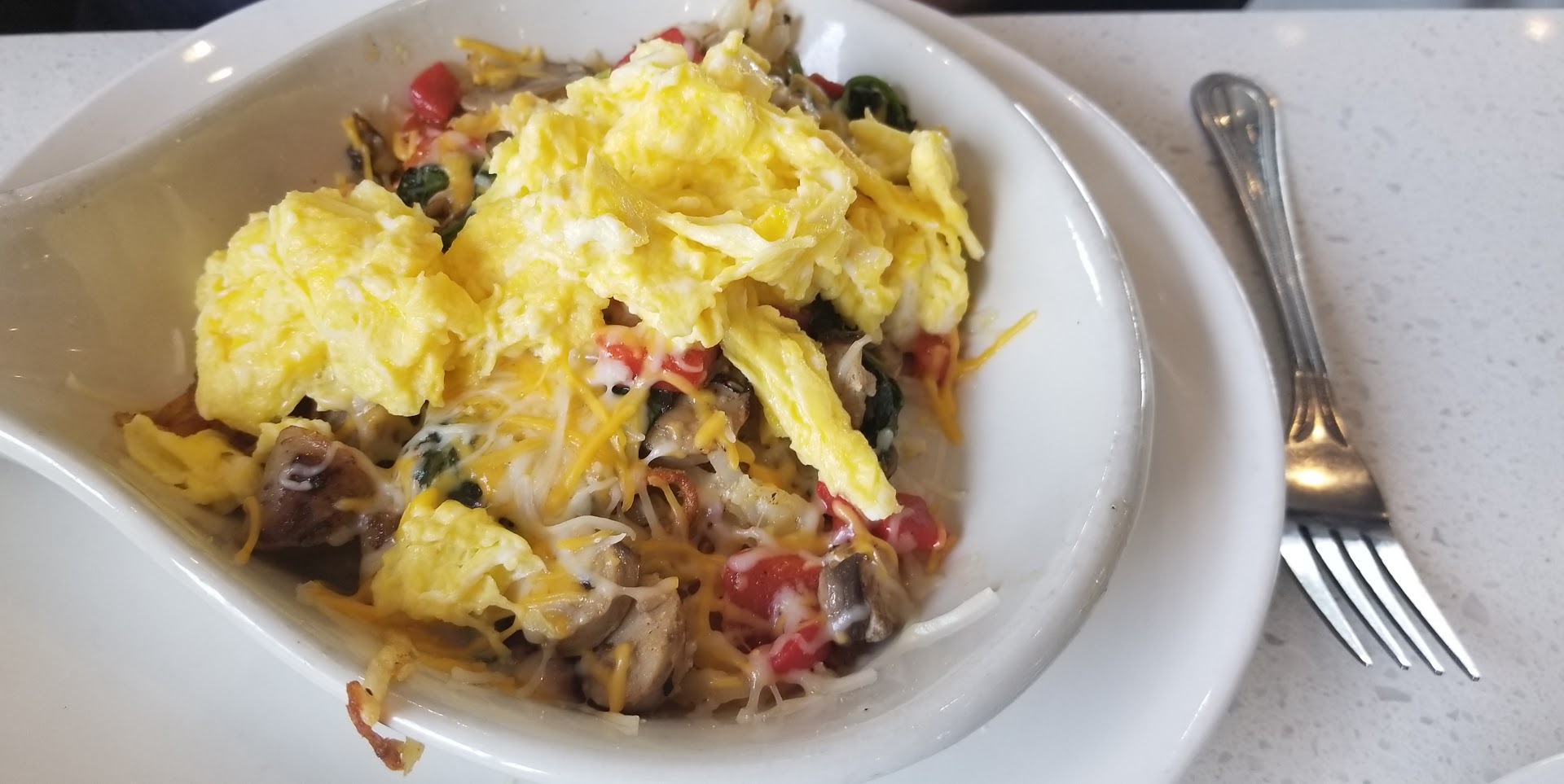 The menu offerings were what you would expect of a brunch place, omelettes, skillets, waffles etc. We both opted for a skillet, I tried the Santa Fe and my friend tried the Eggsquisite skillet. We both opted for a side of fruit. My friend was picking out the large chunks of roasted red peppers in her meal, she thought that it did not compliment the variety of ingredients in it. I thought the Santa Fe was quite tasty but the fresh jalapenos were very spicy and I ended up picking out most of them. The fruit was a bit firm, was a variety of cantaloupe, pineapple and honeydew.