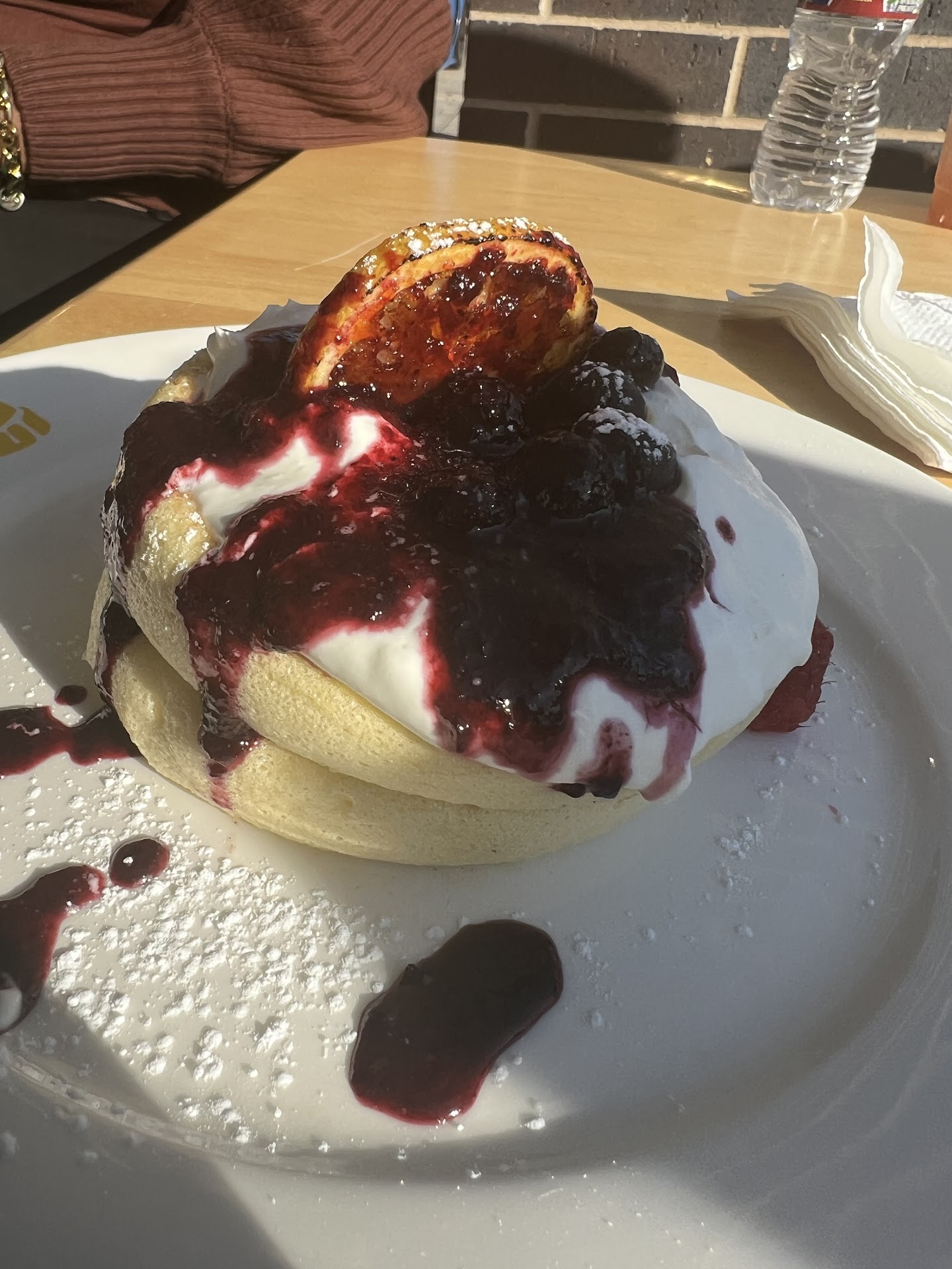 Furthermore, we ordered the pancakes to go, and I don't recommend trying to eat them in the to go box because the syrup was leaking out of the box onto my pants while in the car. The box was also very flimsy.
