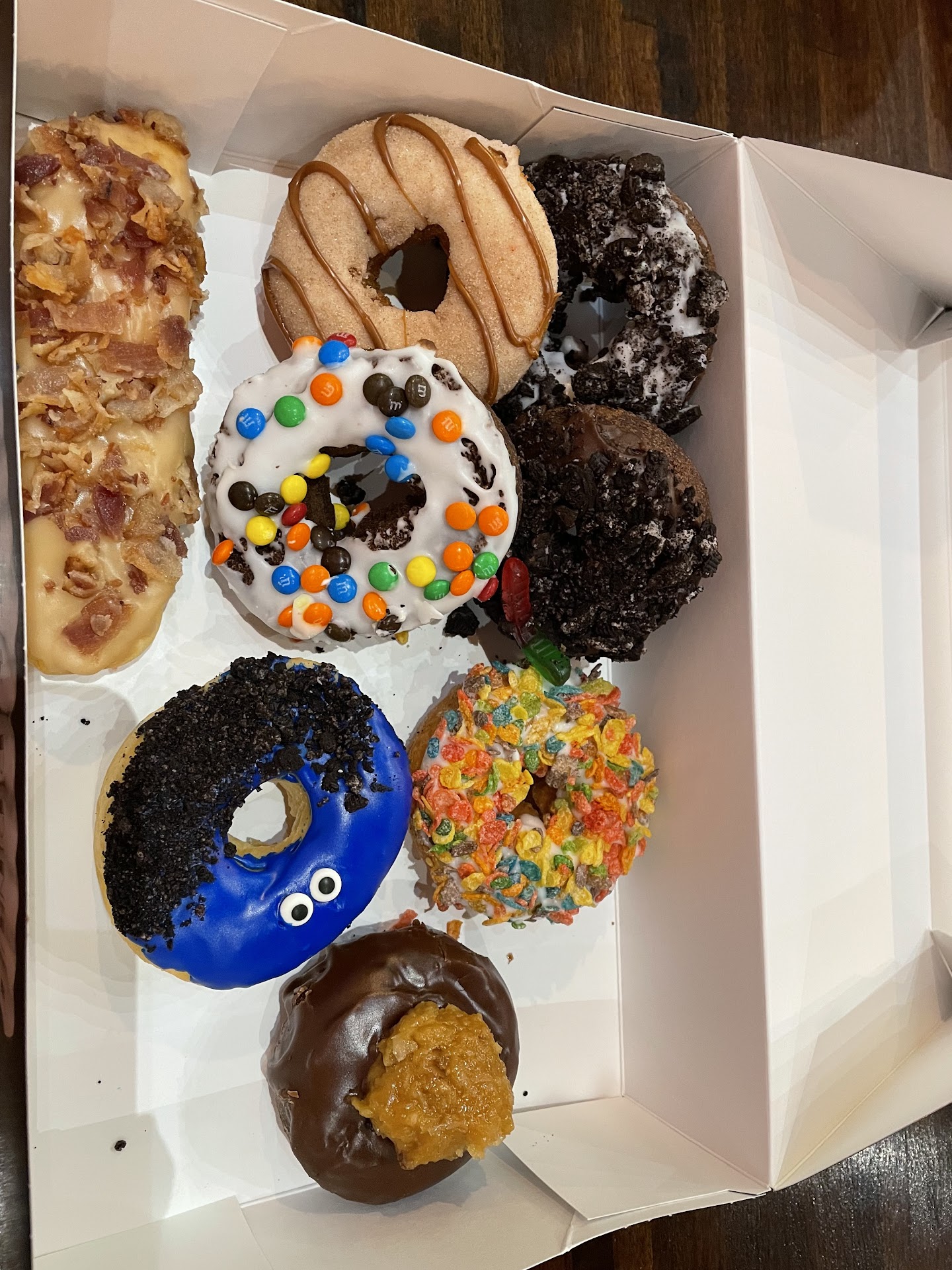 Mint Oreo (It does have mint flavor, but almost like toothpaste) Dirt worm (The gummy worm was the highlight) Little Timmy (Covered in sprinkles, but almost too much so) Flintstones (Missing the crunchy texture because of stale cereal) Bart Simpson (Covered in Butterfinger pieces) Red velvet (True to the flavor, decent enough) **Blueberry Streusel (Very sweet and delicious) Cookie Monster **Caramel apple (absolutely amazing...I literally want to eat a whole dozen of just these) Cotton candy (Cotton candy is literally added on top, but there is no difference in flavor Chocolate sprinkles (nothing special) *Cosmic brownie (Pretty good. Not sure how the donut was different compared to the other ones with chocolate cake, but I enjoyed this one more)