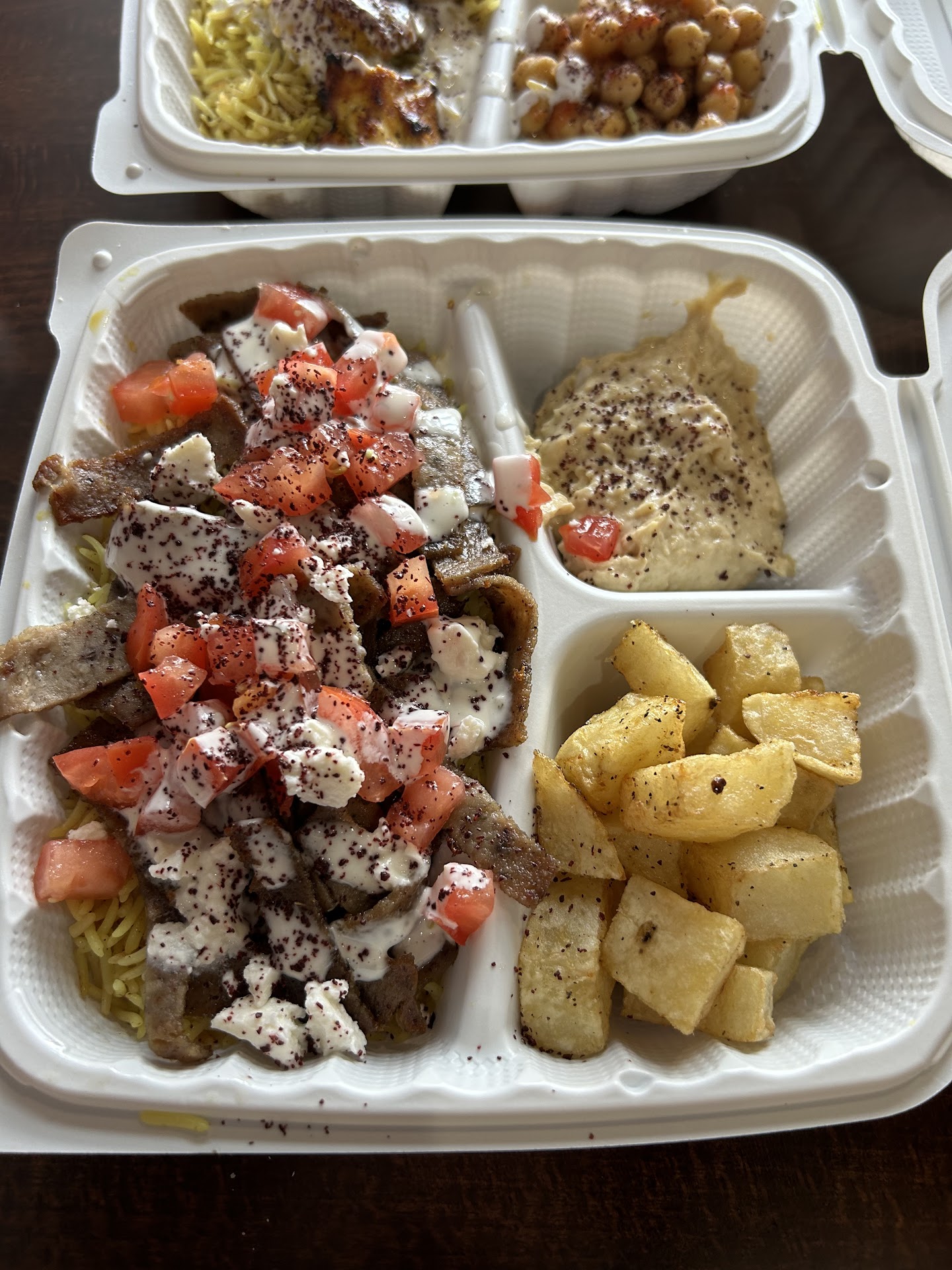 We got a chicken kebab plate with feta and white sauce with sides of hummus and chickpeas, and a beef/lamb gyro plate with tomatoes, feta, potatoes, white sauce, and more hummus and pita. The yellow rice was light and aromatic. The chicken kebab was fresh and nicely spiced, while the beef and lamb gyro was mild and flavorful. Everything was delicious. They offer several different sauces and Iād love to try them all. Iām eager to go back and try the Momo dumplings too. They look amazing. Anyone who enjoys a traditional gyro wrap can find one here, but do yourself and favor and try a kebab plate too. You wonāt be sorry. Iām already dreaming about...