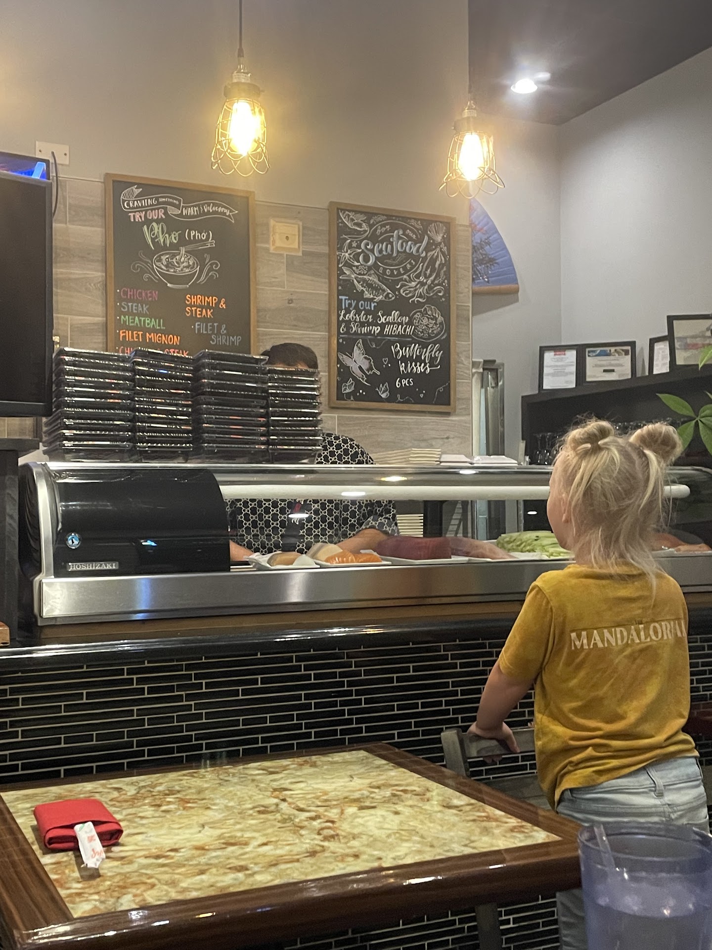 I took my family to visit Koto because I had tried the pho. I thought I bring my family in for dinner only to be disappointed by the service staff. The last time I visited I noticed the sushi chef was drinking an open beer around the food prep area. This time I saw the same sushi chef vaping and blowing his smoke around the food prep area. This was completely disgusting and unsanitary. I had ordered sushi for my kids and I so I had to say something. I approached the counter to find him vaping and scratching his lotto ticket in the counter where sushi is made. I told him that wasn't sanitary and I think he should not be smoking around the food of all places. He just said, "I know, I know..." and looked down. I asked if he could wear a mask which he did put on but during our meal he snuck in his habit which clearly is fine with the entire staff. I'm in the food service business and that's unacceptable if it were my establishment. I'm no longer a customer. Our server also had a cough which later were told she had asthma... not sure how true that is. There are many more places to go where the sushi is delicious and the chefs are practicing good food and safety and proper food handling NOT drinking open...