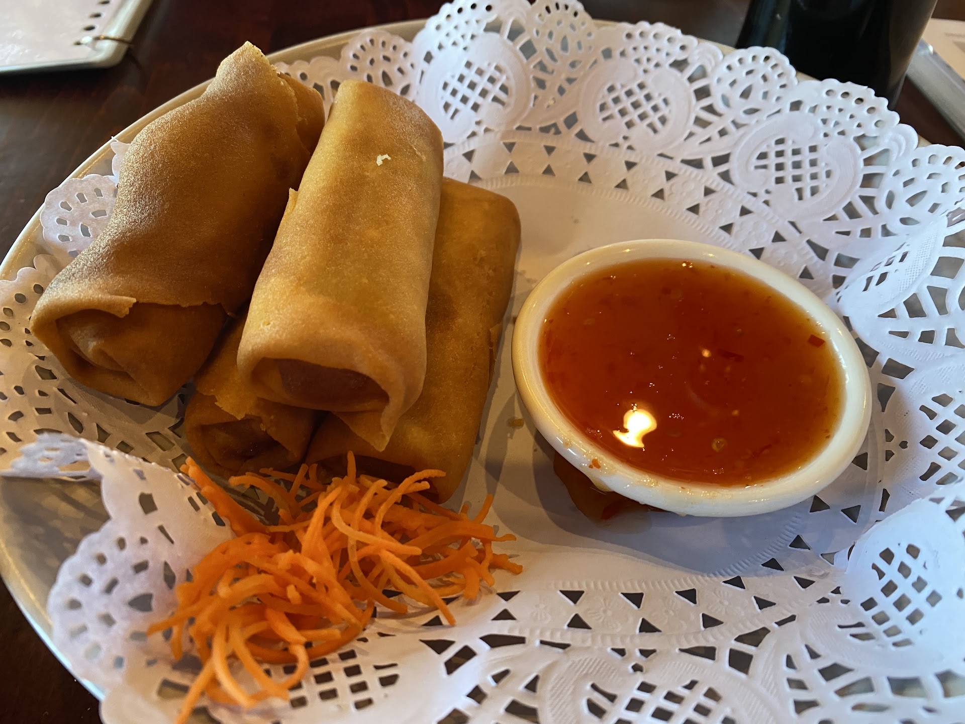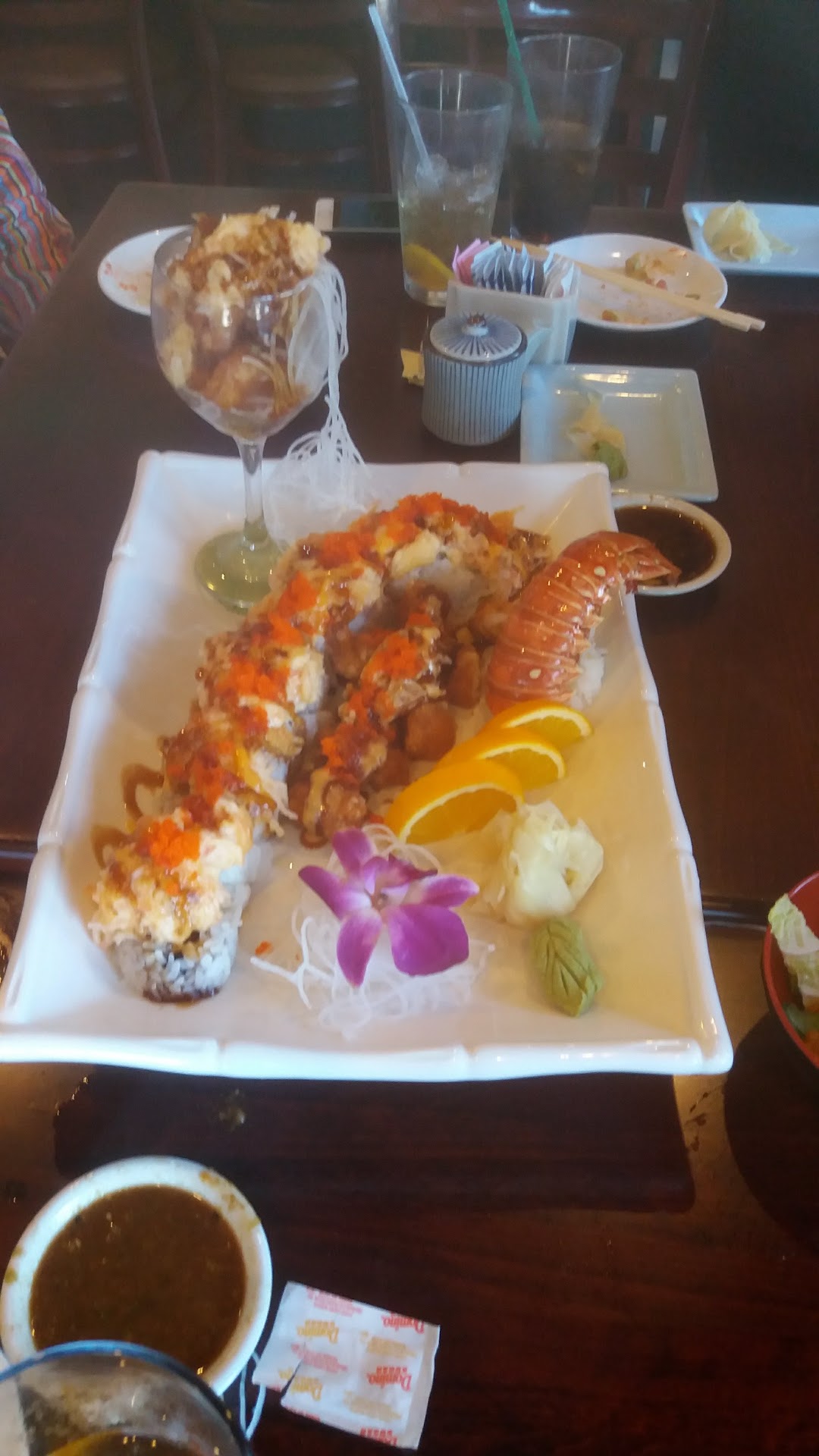 I came here with a friend last weekend based on his recommendation. This restaurant used to be a Thai restaurant and had either a change of ownership or expanded their menu. Anyways, when we arrived, we were welcome fairly quickly and asked where we wanted to sit. Originally, we decided the bar area but ended up moving to a table nearby. Our waiter, Sean, greeted us and provided us with 2 menus - a paper one and a more descriptive menu with pictures and ingredients. We were also served warm water with lemon in a mug. Sean was helpful in giving his recommendations when we wanted to decide our order. We ordered Veggie Egg Rolls for our appetizer. We also added on a Bonsai Roll, Cosmo Roll, Wasabi Caviar, and Quail Eggs.