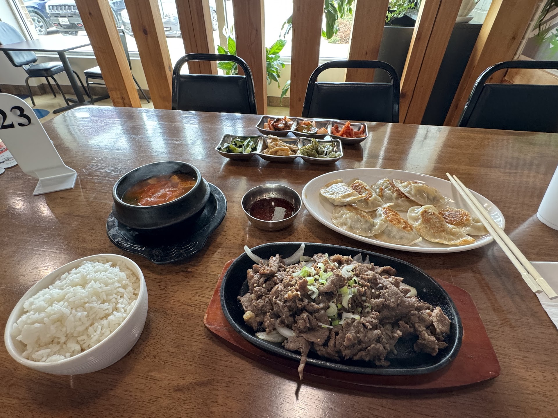 Read moreWe went on a Sunday afternoon, around 12pm. It was not very busy, so it was somewhat peaceful as we ate. When we arrived, we ordered at the kiosk and chose our table. The waitress was very sweet and came over to make sure we knew we had ordered extra rice (which we didn't realize, and when we asked to remove one of the extra rice she was very kind and helped us remove it from our order). The food was brought to our table after about 7-10 minutes of waiting, which was relatively quick in our opinion. We ordered the bulgogi, fried dumplings, and spicy beef tofu soup (순두부 찌개). The bulgogi was good and was a generous size, and the soup was really spicy for my husband (who felt it was important to note that as a Korean person, he felt that was the perfect level of spicy flavor), but he felt that the level of spiciness was the only noticeable thing about the soup. The flavor of the soup really didn't stand out from other Korean restaurants in the DFW area. We were not very impressed with the dumplings though, they were only fried on one side and the flavor was a bit dull. Overall though, it was a...