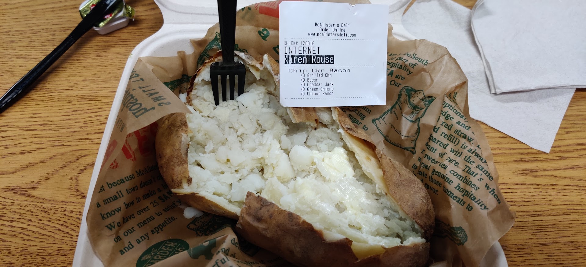 Update 2: My wife and I stopped in for dinner tonight at McAlister's. McAlister's was nice enough to offer us each a free dinner to make up for the dry potato.