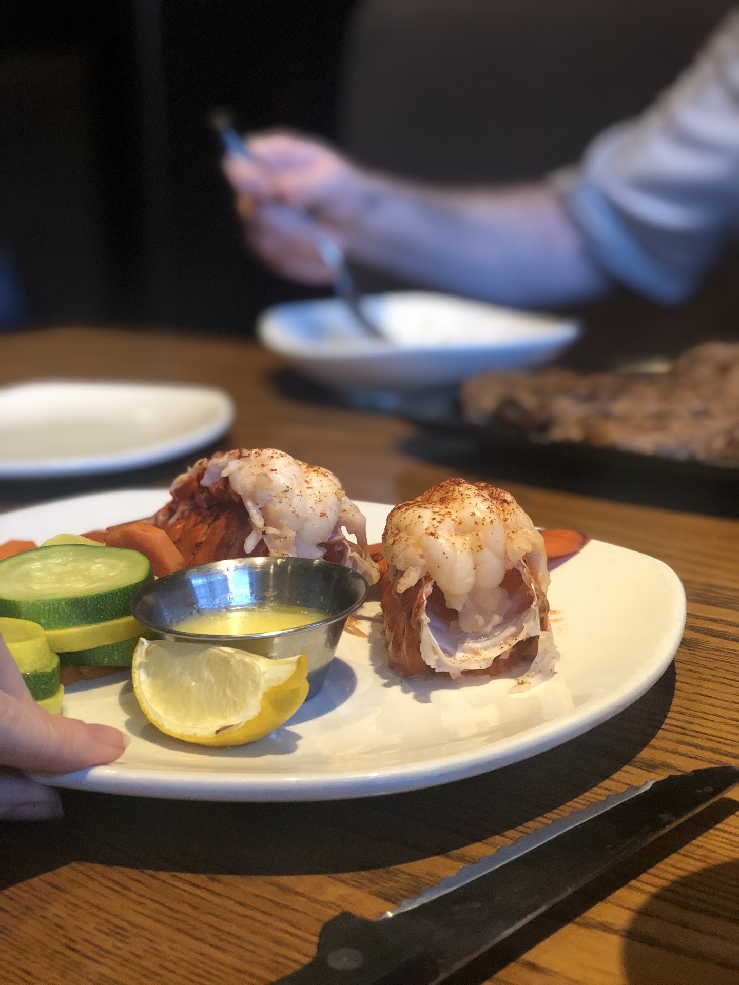 My hubby and I went out for a date night with a gift certificate I was given from my parents. When it comes to the staff here, the manager and server were incredible. They really set the bar high when it comes to helping and accommodating someone with a food allergy. We didn’t feel shamed with their gluten free menu that was available with request. For starters, we did get their complimentary bread with whipped butter. It was a decent bread. We ordered our drinks and got their skewered shrimp for an appetizer. My husband ordered their porterhouse steak. I got the lobster. We both got salads and steamed veggies.