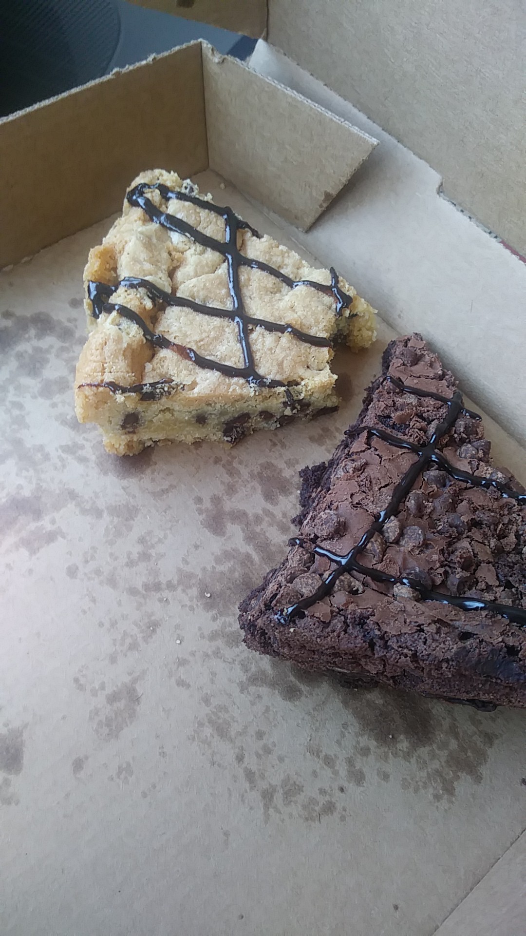 All of the options can be rather confusing, but the staff was very helpful and friendly. This is similar to a Freebirds/Chipotle where you just pick your toppings - I appreciate that you don't pay "per topping" here. I had the Farmer's Market - no tomatoes (yuck) add black olives and artichoke. I was very pleased, it was amazing. Kids shared a cheese and corn pizza (why? because they can. That's why.) Wife had a buffalo chicken pizza. I didn't try it, but she says it was good. We shared a brownie slice for dessert. It was extremely rich, but I expected nothing less. The staff was amazing, attentive, and very helpful. We got our order extremely fast. They have indoor and outdoor seating. We say outside - it was warm, but a nice breeze kept it manageable. This was my first time here, and I wish I'd been sooner. This is a great place to grab a quick (and excellent) meal...