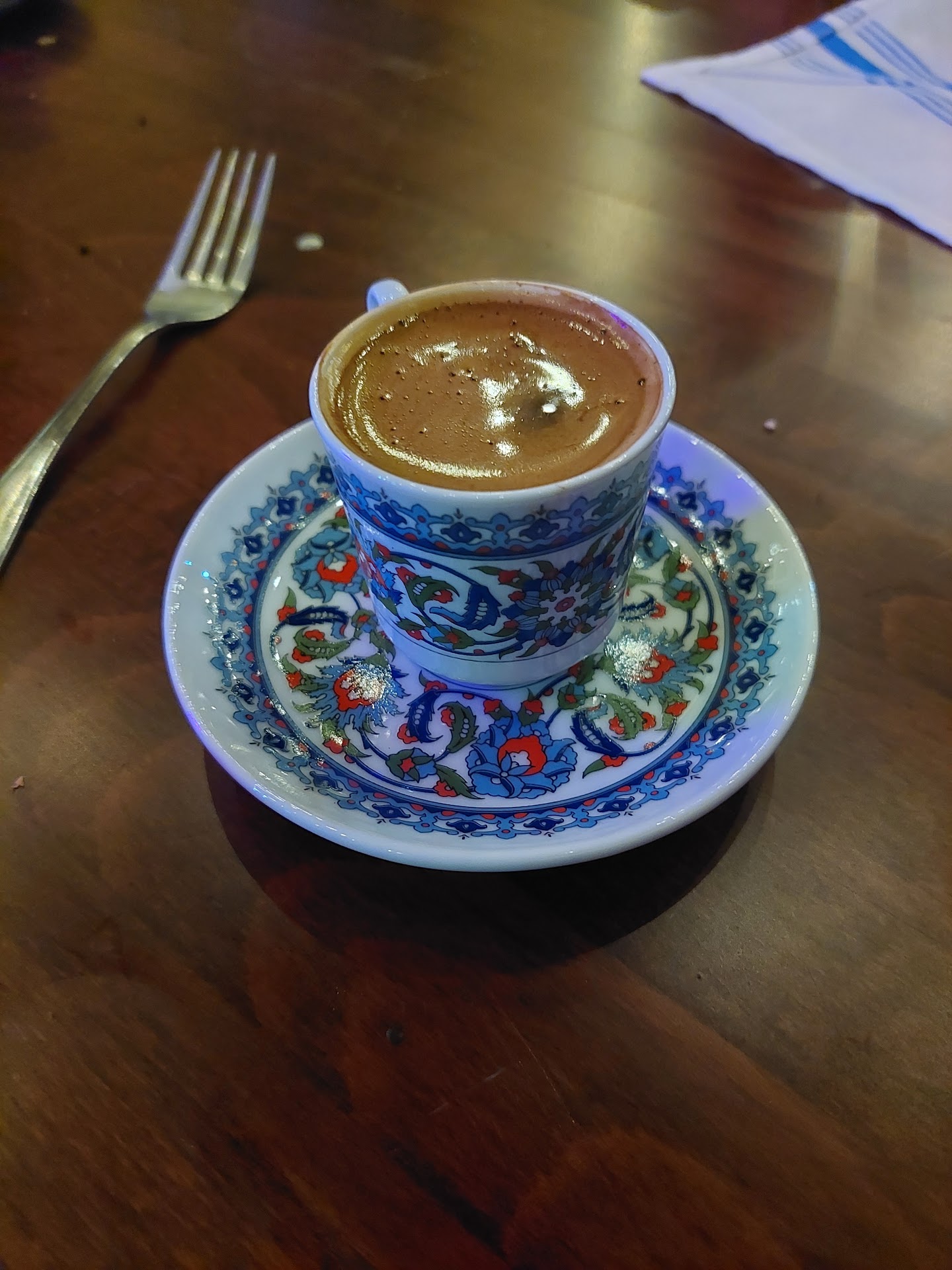 Fried Cauliflower $14.49 Halloumi $14.49 Lamb shank (my order) $27.95 Beef shish (husband's order) $24.84 Turkish coffee $5.18