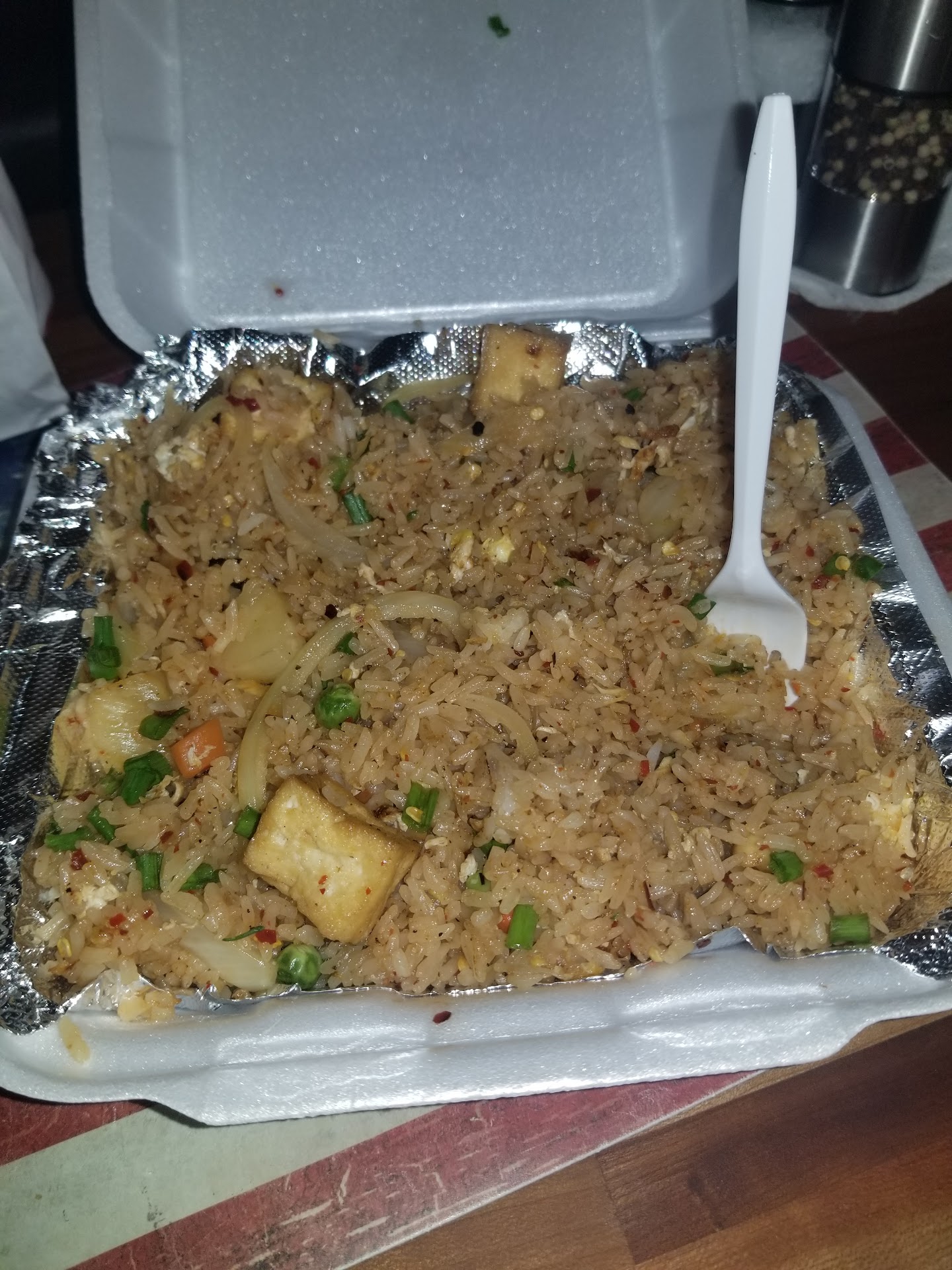So I hate to leave bad reviews, especially on Christmas Eve, but I was very disappointed... Decided to try this for the first time. The waitress stayed on her phone long after I had finished looking at the menu. I ordered Pinapple Fried Rice with tofu to go and she said it would be ten minutes. I ran across the parking lot to get a drink and came back and sat down up front. I was never greeted again. I sat and sat while the waitress talked to her friend or coworker, food came out and she sat it on the counter. I then here her several minutes later say "that food is for the woman parked out front (me), I dont know why she isnt coming in"... I stand up and walk over and she immediately looked embarrassed. Even if I hadn't been in the building (which she would have know if she looked around as the other woman had seen me waiting) what stopped her from bringing my food out rather than let it start to get cold. I decided it was fine and took my food and left. When I get home and ho to eat it it tastes like chicken... As a vegetarian I cant eat that so I try to call to verify there is no meat in this dish. The phone goes unanswered 2x. I call a different location of theirs and the woman answers and says it shouldnt have meat in it. They weren't closed so not sure why they didnt pick up. Now I have a nearly $13 meal I dont feel safe eating. Merry Christmas Eve to me!