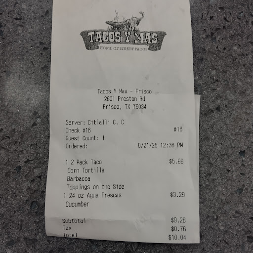 I work in Stonebriar mall and wanted to grab a quick bite to eat from our newest restaurant in the food court Tacos Y Mas. When I arrived to the counter there wasn't anyone there, however that was great for mw as it gave me time to look over their menus. I was later greeted by a gentlemen who took my order. He didn't give his name, but that was also ok for me because I like to ask questions. I decided to go with a birra taco plate and chirros which I must say was very good. The tortilla was fried to a light crisp and the meat was tender and flavorful.