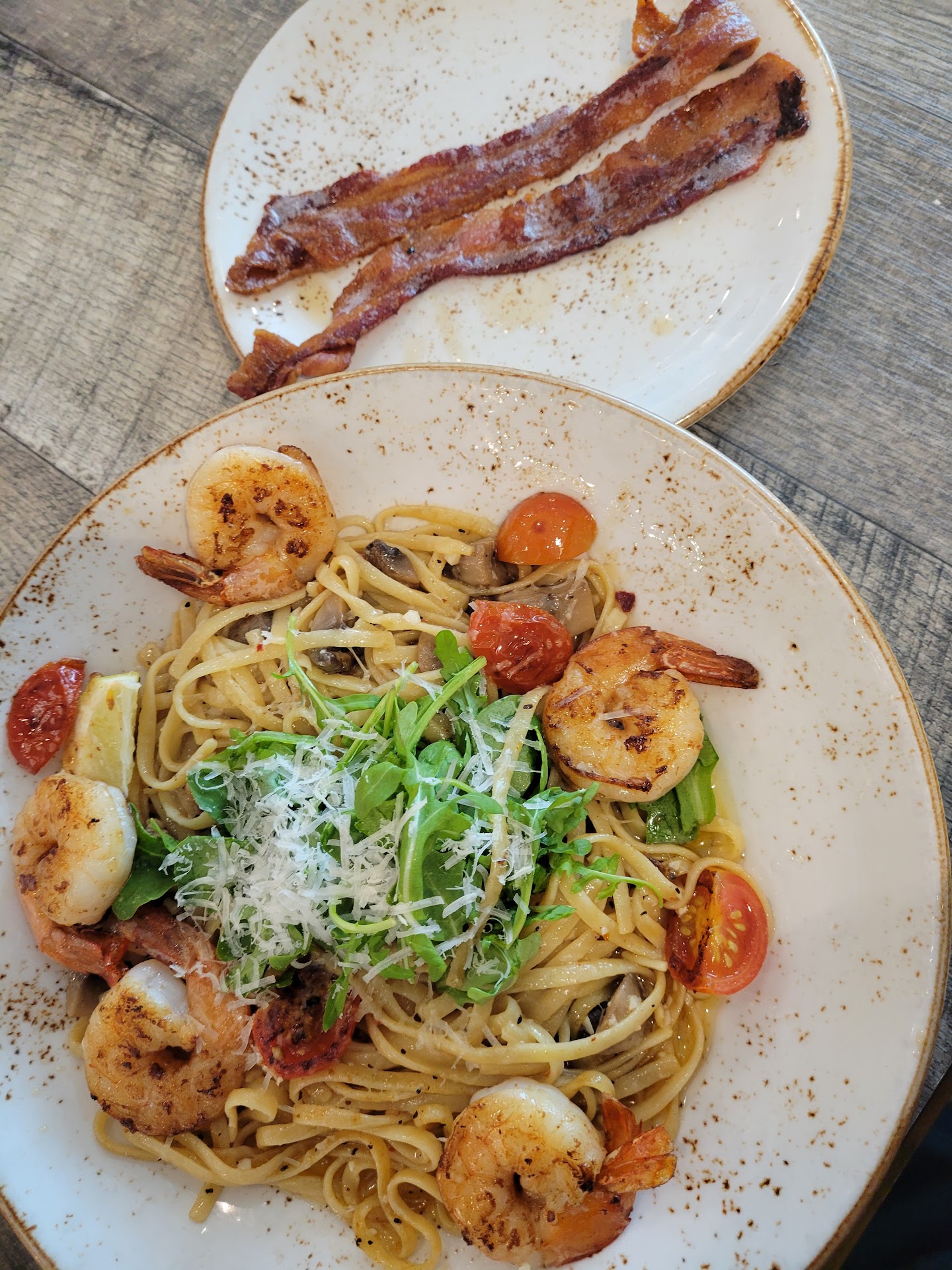 I ordered the Prawn Linguine with mushrooms and a side of crispy bacon. My friend got the Eggs Benny with Atlantic smoked salmon. They were really accommodating and conscientious about any food allergies or specific food preferences. I also hear the Banana Bread dessert is the real deal. We've got totally happy tummies, and at these really affordable, wallet friendly prices, I have absolutely zero complaints!