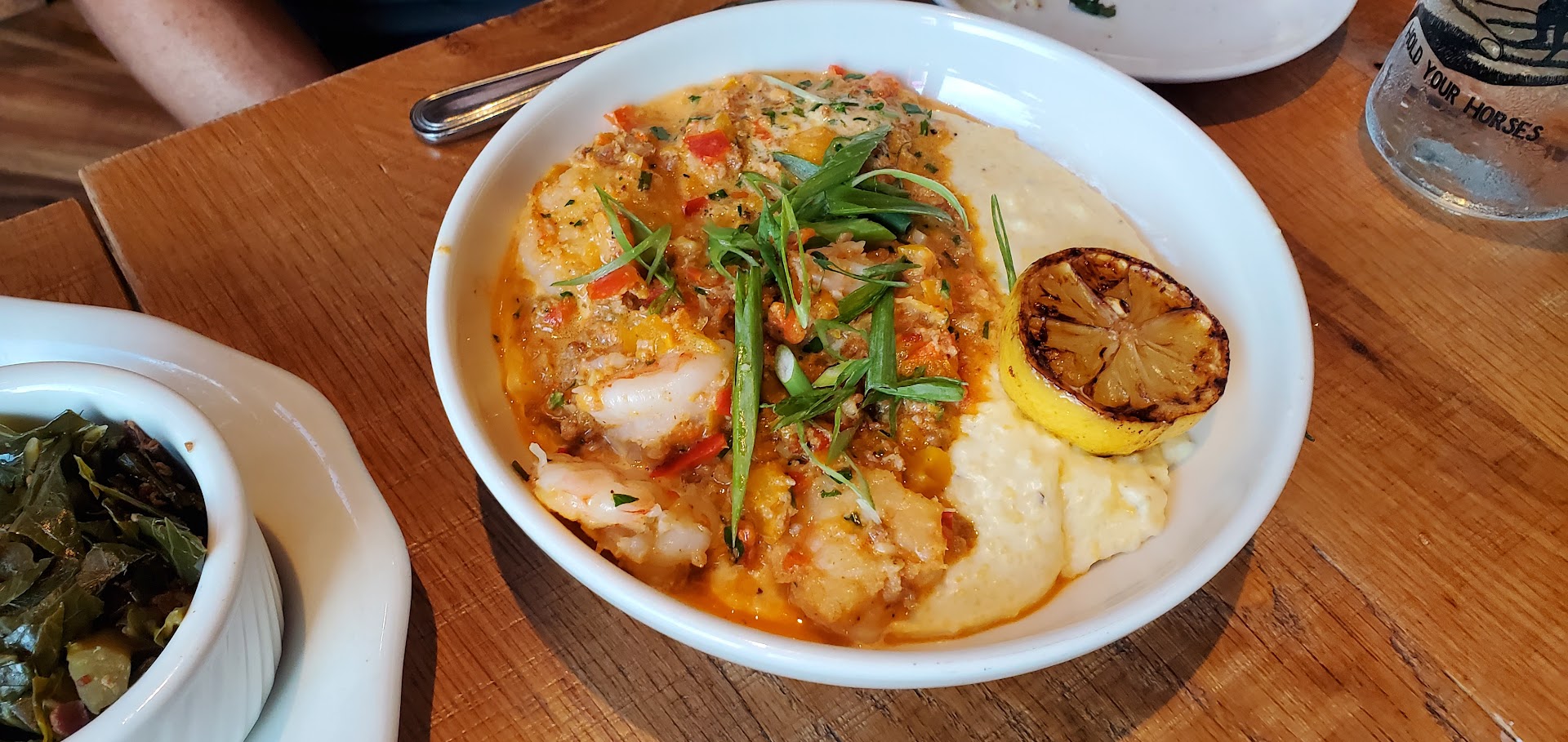 TUPELO SHRIMP & GRITS (GF) sustainable & wild-caught white gulf shrimp, chorizo pork sausage, peperonata, creole sauce, scallions, over heirloom grits with goat cheese. $19.95