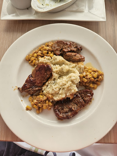 They eventually brought my meal, which was disappointing after a long wait. I had the BBQ pork with poblano grits and "off the cob" elotes. The pork was WAY overcooked, dry, and tough, and the only flavor it had was the barbecue sauce brushed directly onto it. It looked like they cut up a larger piece of pork and cooked the hell out of it instead of cooking a larger piece properly and then slicing it for plating. The elotes had no flavor (just butter and a whisper of chili powder or smoked paprika), and the grits, while nicely textured, were missing seasoning. Very disappointing. My husband's burger was delicious, however, and I ended up eating what he didn't want instead of my own meal.