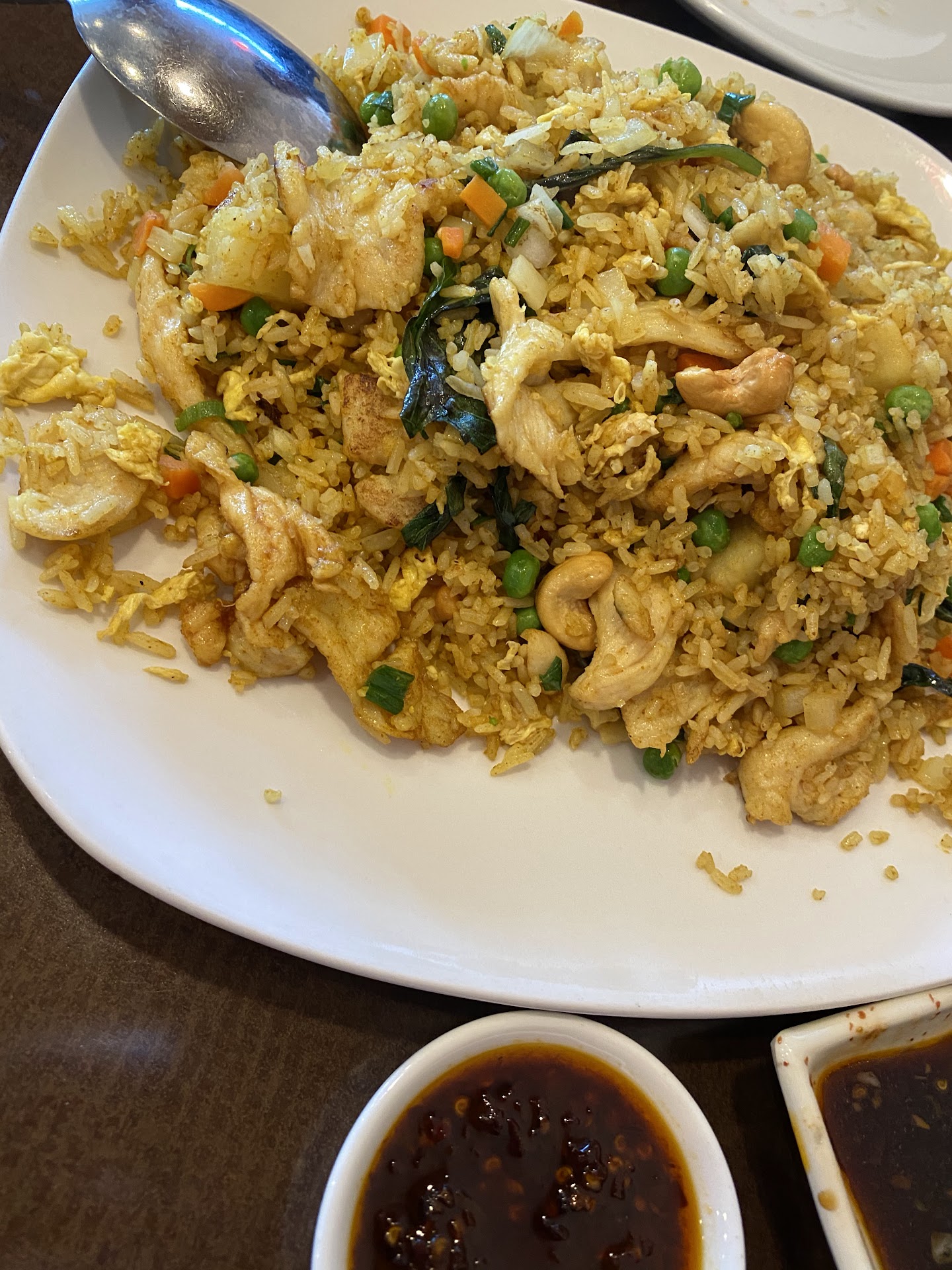 Which culinary treasures will make you feel warm and cozy inside while you eat on a cold day? Try the peanut curry with chicken. Peanut not your flavor? Try the yellow curry with shrimp or chicken. If you have a big appetite, try the fried rice with shrimp. The shrimp are so big and portions so generous, youâll think you got an extra portion for free.