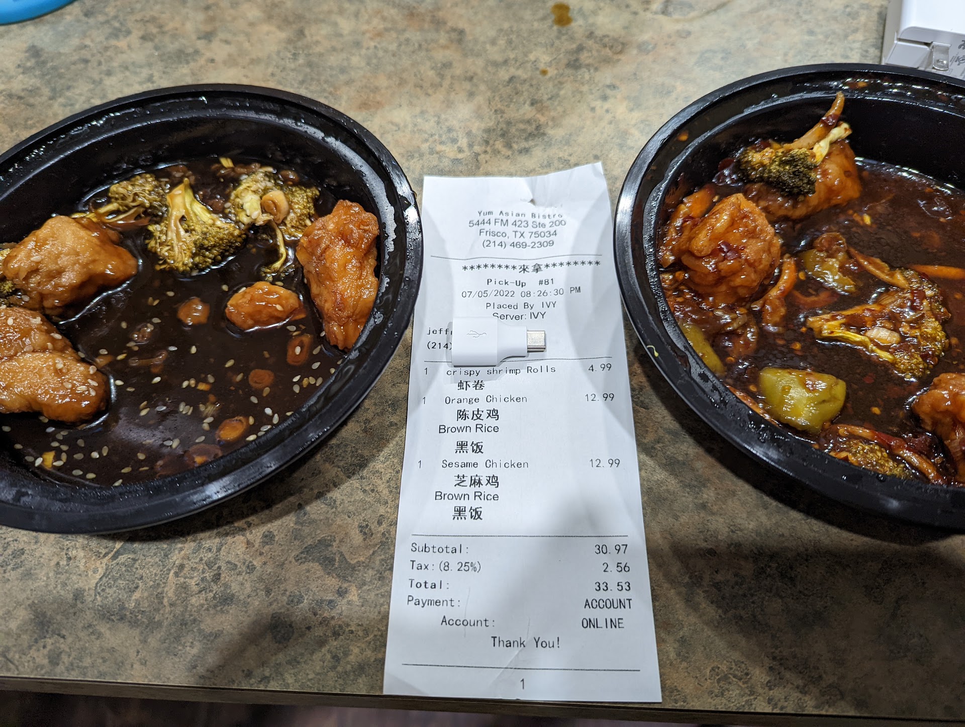 I ordered 1 order of crispy shrimp rolls, 1 orange chicken and 1 sesame chicken, both with brown rice as the side.
