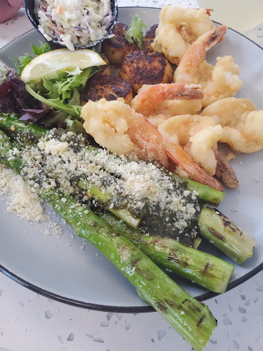 Read moreI went for lunch with my husband around 11:30. Upon entering you truly do get delighted by the decor and esthetics. We waited about 5 minutes before we were seated. There was no hostess on the hostess stand but a waitress attending other patrons did acknowledge us and stated she will be right with us. Our waitress was very personable and attentive. We ordered the fried grouper bites for appetizers. The batter was very light. It didn't provide the crunch I was craving but it definitely did not take away from the freshness of the grouper. I do wish the grouper bites had more flavor and for the price of $18 was expecting a bit more of wow factor. I tasted salt of course but was expecting more a hint of something else. Husband and I just added a dash of hot sauce and black pepper to give us something more in each bite. Husband ordered the Lobster special on Thursday's which comes out to about $20 for a lobster and a side. His side was the truffle fries. He definitely liked the lobster but was a bit frustrated that he had to fight the shell. Most places usually cut the tail and crack the claws a bit to make it easier for people to consume. I ordered the fried red snapper which came with a side of rice and sweet plantains. I was also craving their pimento cheese grits so I ordered that as well. The fried red snapper was delicious and very crispy but still moist and tender on the inside. Definitely was my favorite part of the meal. The rice had the poke bowl rice flavor (poke sauce and spicy mayo) to it which caught me off guard but then again they do have sushi and poke bowl on their menu so I'm sure they use the same rice. The sweet plantains were well cooked and tasted just fine. However, my biggest disappointment was the grits. I don't know if it was the pimento cheese that gave it such a pudding/mousse like textured but I did not feel like I was eating grits at all. The flavor was good but I think the pimento cheese definitely overpowered the whole dish. Service was great! Food was good. And overall quite a nice food experience. I would probably go back with friends to try the lobster roll and lobster bisque but I don't think we'll re-order the same...