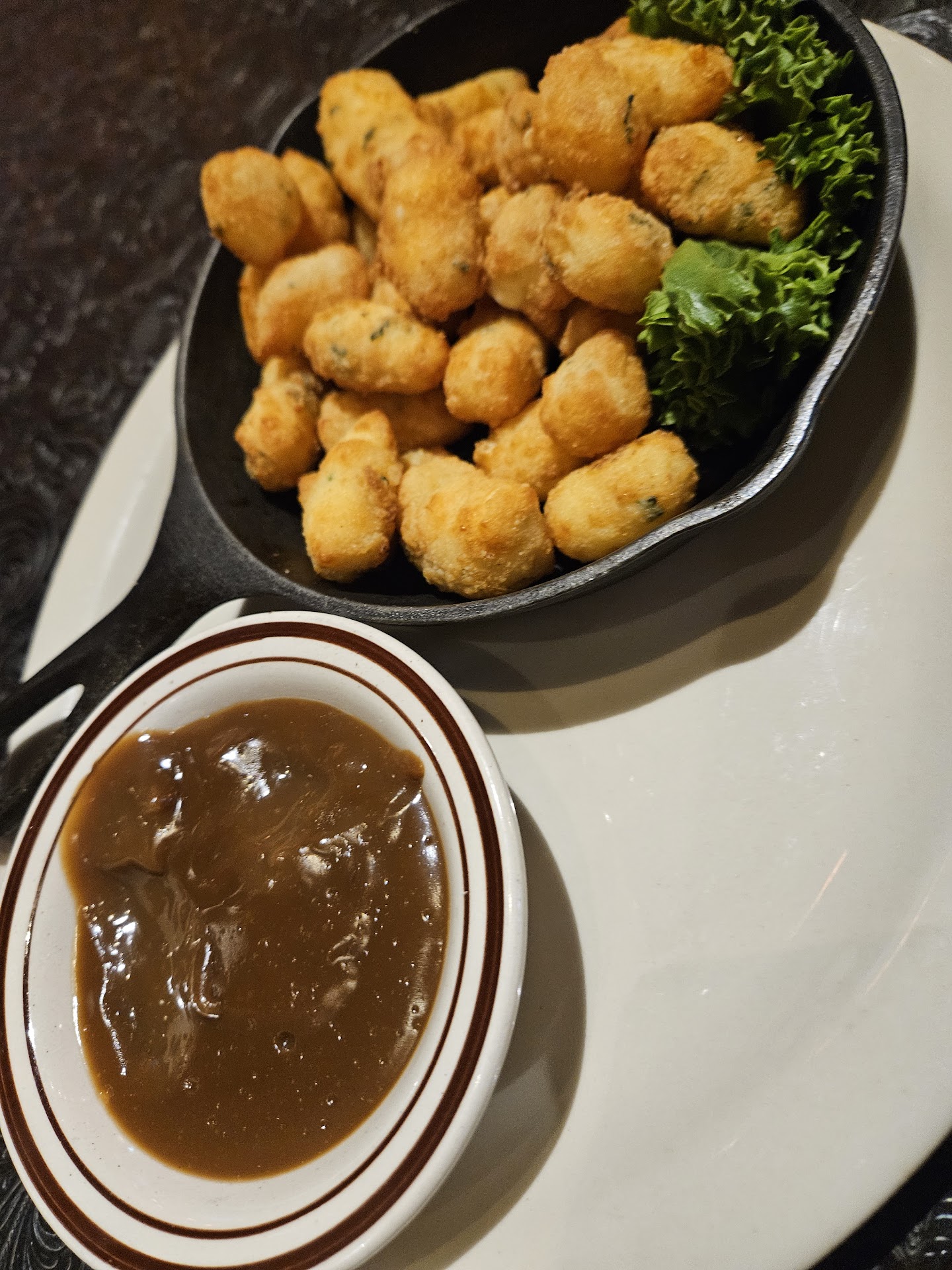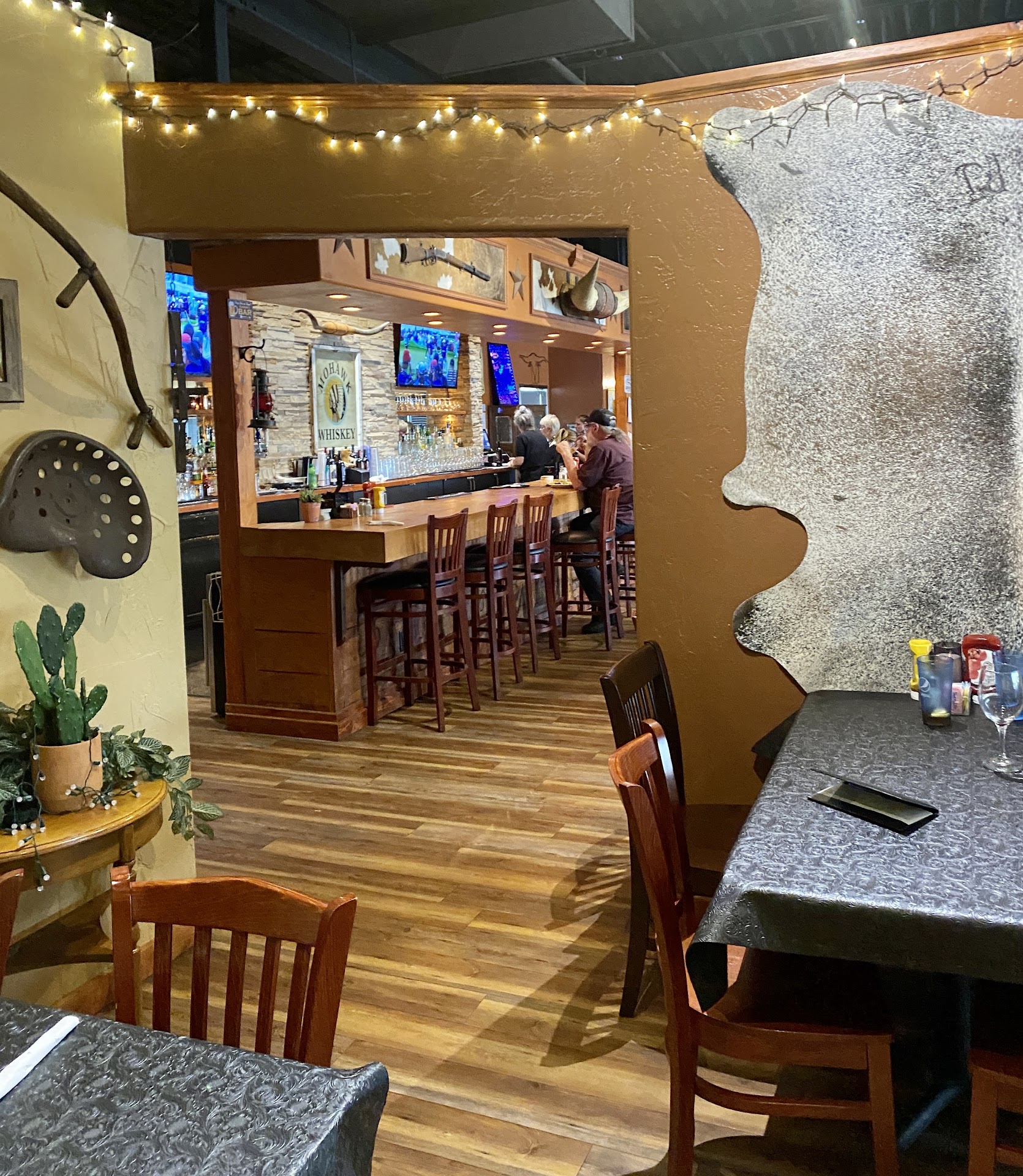 This was a nice open barn style restaurant with Cowboy and Indian style artwork around the walls. Several old rifles to look at, some animal hides, and other unique western style decor. Tables are nice wood style (outdoorsy), but comfortable. They were put a bit close together, though. I heard more of the table next to me conversations than I cared, too. This place could get very loud if it had been a busy night. We visited on a Tuesday about 1/2 of the restaurant was full and getting busier as we were leaving. The restaurant offers specials each night like surf and turf on Tuesdays, Prime rib on Fridays, etc. $$ is the average pricing.