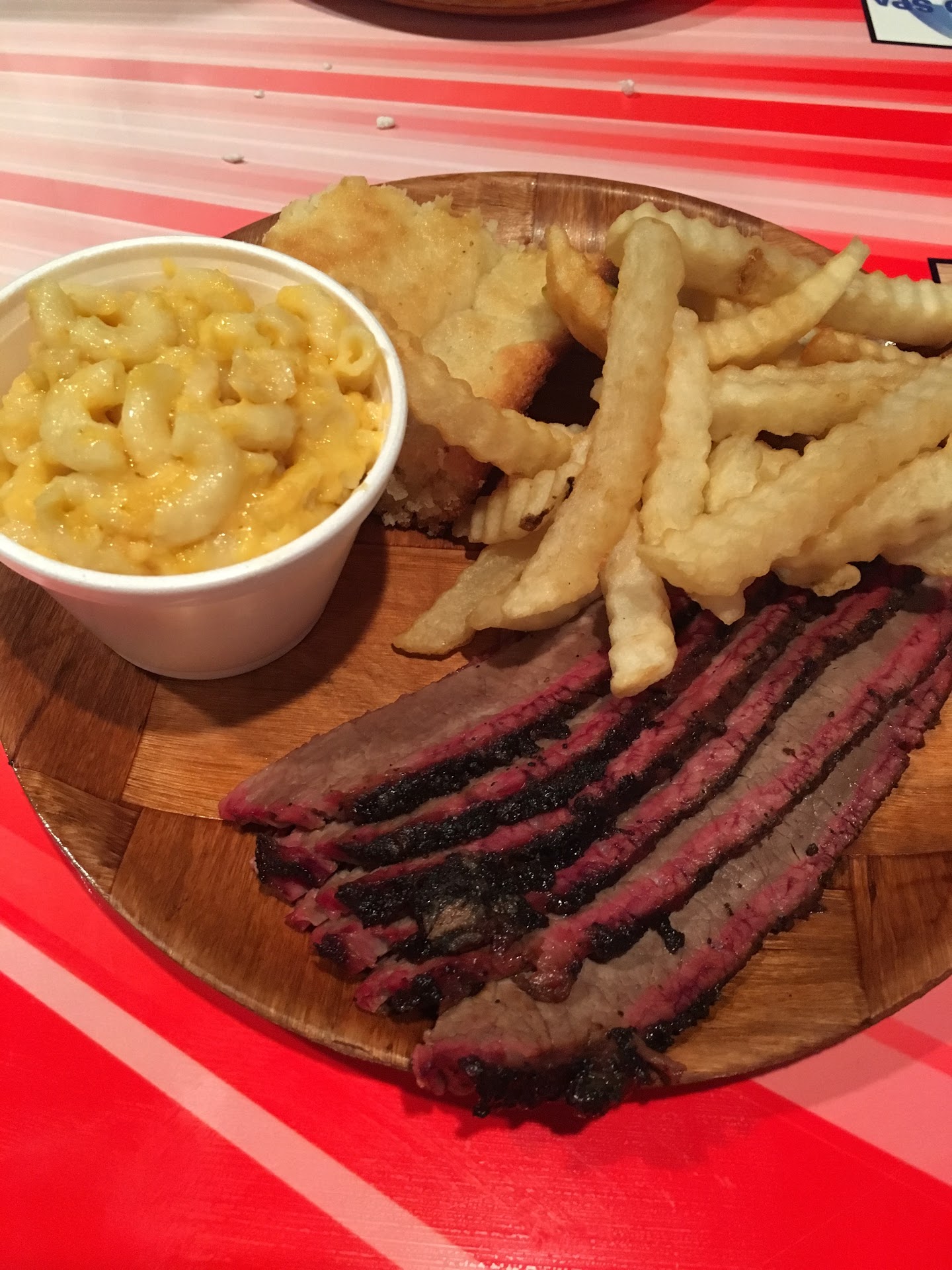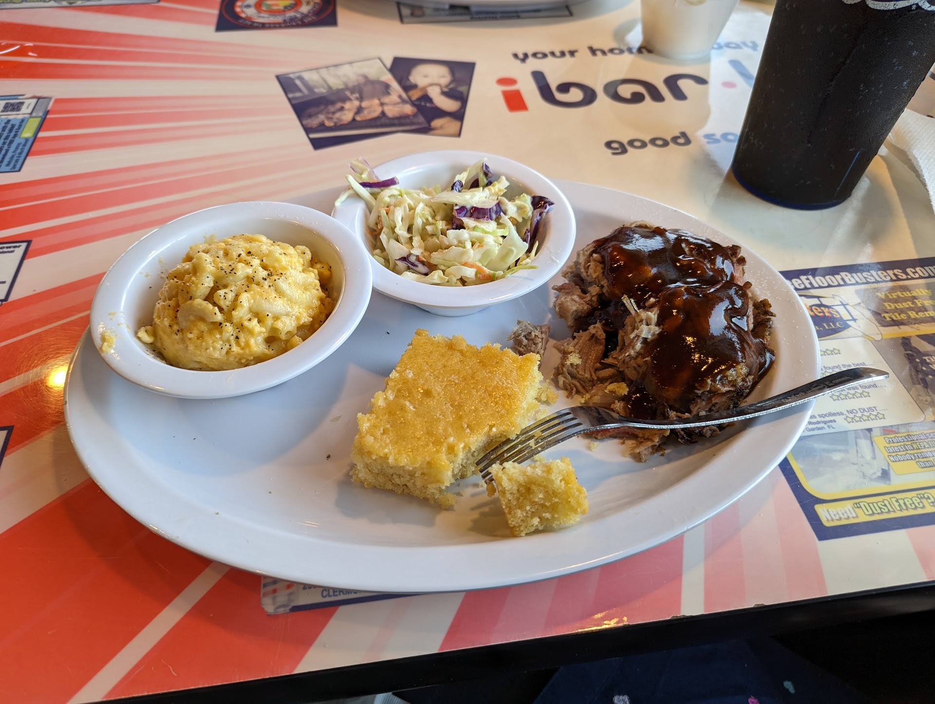 Read moreI give 2 stars because I have had the take out before and I knew it was good food. I really like the Mac and cheese and ribs. However, my experience as a dine in patron last night was a different story. More like a 1 star experience. At 6:45 on a Friday night we were told that both the brisket and the ribs were out...a bit annoying since that is what we came there eat but we were understanding and chose other items. I asked to look at the menu again and the waitress impatiently just rattled the other meats to me instead...btw I was thinking about changing my order all together to something like a burger at this point but was rushed and just chose a meat. 5 minutes after we were served though, our neighboring patrons were served brisket. At this point my husband was pretty upset because we would’ve gladly a few extra minutes for his meat of choice. Our server was not accommodating at all and didn’t even think to make the correction nor were any drink refills offered along the way. We did mention that we noticed that brisket was available to our neighbors but not us, but our waitress didn’t seem to care. Unfortunately this will likely cause us not to go there for a while. A shame really. We were really looking forward to a dinner out with the family and wanted to enjoy a local small business restaurant, however it came at a disappointment because of the service we received. Next time we go to BBQ it will be to one of the other popular local chains where I haven’t received such...