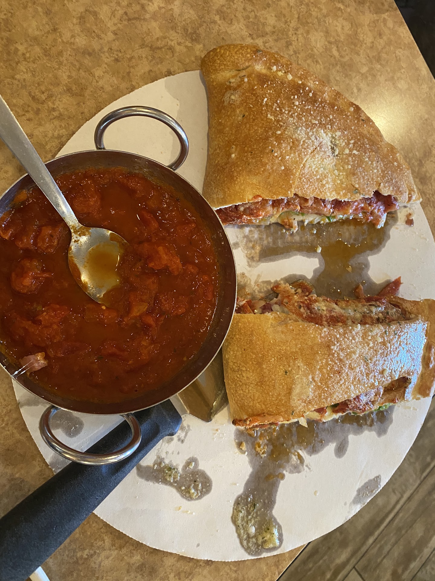 Read moreThis was our second Stavros and Sons in Fruitland Park. (Our first visit was to satisfy a craving for pizza, and this restaurant came highly recommended.) On the second visit, we decided to experiment a little bit and we ordered the stromboli, and knowing that we were going to share it, we ordered the large size. CAUTION – when they say large, they mean large. This Stromboli was enough to overfeed each of us for lunch, and we still have a little more than half of it to take home. Absolutely brilliant work in the kitchen: the crust was novel, crisp, and a little sweet. The interior was loaded with delectable onions, sliced green bell peppers, cheeses, a variety of meats and sausage, and delectable seasonings. I think we were both impressed: this is a great meal, and it was a good bargain - including a draft beer, a Coca-Cola, and hot coffee the entire bill came to $31.30. We paid $40 (including tip), which is a bargain in today’s luncheon marketplace. There was plenty of parking close to the front door, the air conditioning system was working well, and the booth was comfortable. Our server, Adam, was very attentive to our needs, and he was clearly very busy since the restaurant had only a few booths open at the time. Since Adam is the customer contact person who we see as representing the restaurant, he certainly leaves customers with a favorable impression of Stavros. (Atmosphere was noisy for me, but I put my hearing aids on noise-cancellation and Viola! Instant quiet!) Photo is of the more than 50% remaining of the large Stromboli after both of us had eaten our fill, plus a...
