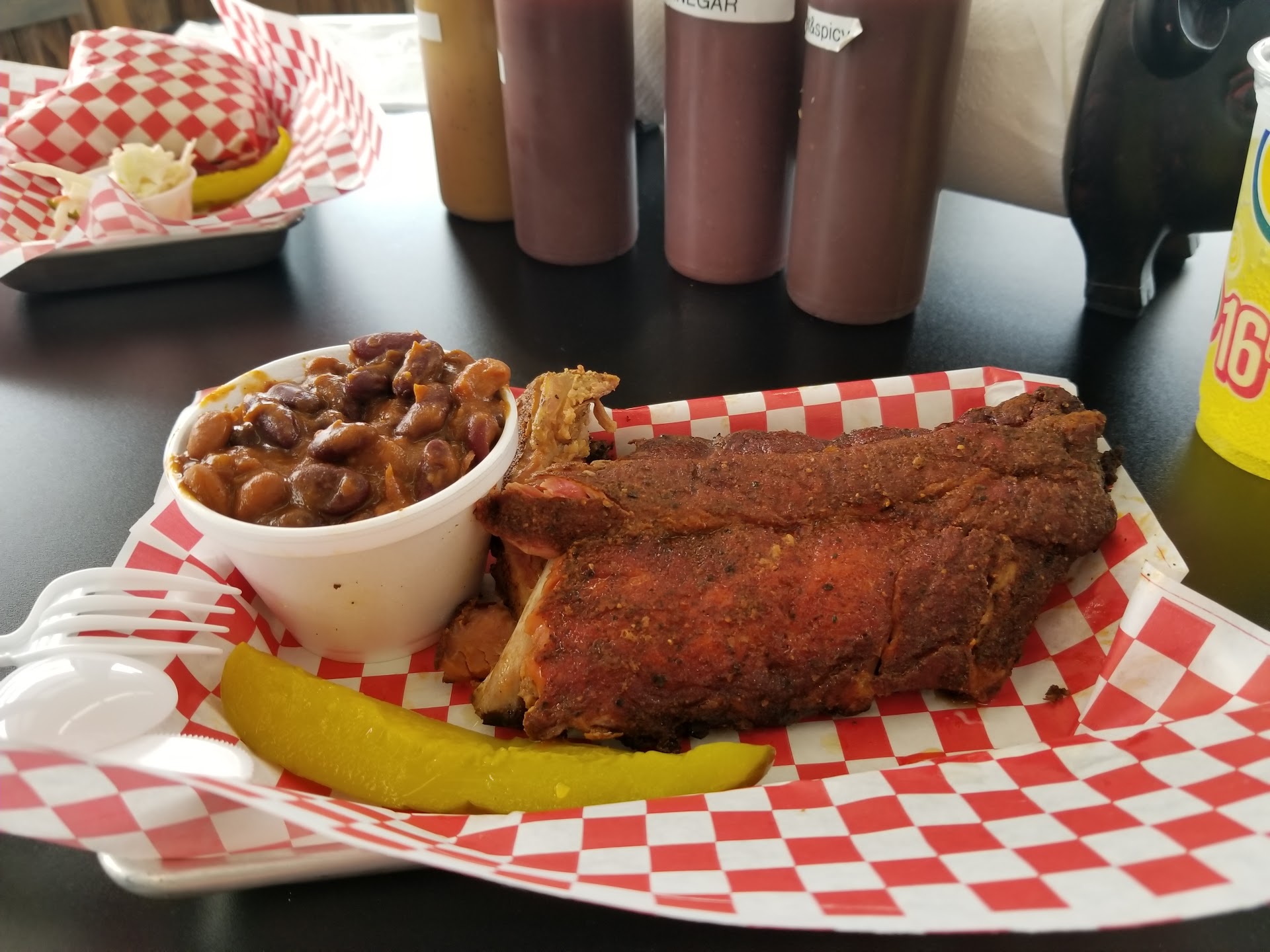 ** May, 2018 Those were quite possibly the best ribs I've ever eaten. They had just come out of the smoker, and they just fell off the bone. I used just the little plastic knife, and the ribs fell apart into little perfect bites. And the sauces were a little different but all good, and that vinegar sauce...