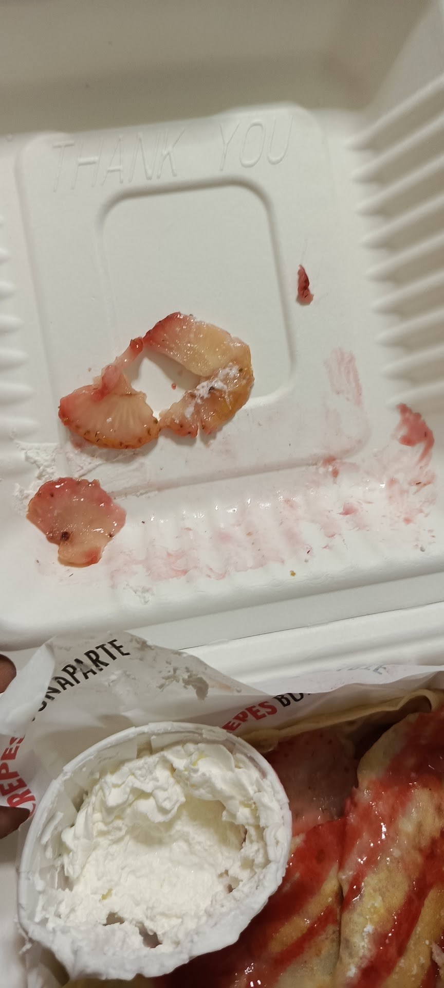 Ā Ā Ā Read moreIF YOU HAVE YOUR MIND SET ON SOMETHING TO GET, BUT THEN LAST MINUTE DECIDE TO TRY SOMETHING ELSE... DONT!.. LOL. OR ELSE YOU'LL REGRET IT, LIKE I DID. I'VE ALWAYS GOT THE "BANANA FROSTER"(HIGHLY RECOMMEND). AND I HAD BEEN CRAVING IT. BUUUT, UGH, I WAS CONTEMPLATING ON TRYING SOMETHING ELSE. AND THE GIRL RECOMMENDED ME TO TRY THEIR LIMITED TIME VALENTINE CREPE. SINCE THEY DONT ALWAYS HAVE IT . AND UGH š© I REGRET WASTING MONEY ON SOMETHING I DONT EVEN WANT TO EAT. MOST OF THE STRAWBERRIES WERE EVEN RED.(provided pics. Which my phone keeps on trying to enhance because it knows it's "food" but in person it's not this red lol) TRIED 2 BITES AND JUST WAS DISAPPOINTED š. MY MIND AND MOUTH WAS WAITING FOR THAT BANANA FROSTER THAT NEVER CAME. IN MY OPINION, THATS ALL I FEEL THAT THEY HAVE THATS GOOD. I ALSO GOT THEIR LAVENDER LEMONADE, WHICH WAS GOOD. BUUUT A LITTLE ON THE SWEET SIDE... LEARN FROM MY LO$$ AND MISTAKE, TO NOT TRY ANYTHING ELSE, IF YOU ALRDY LIKE WHAT YOU'VE...