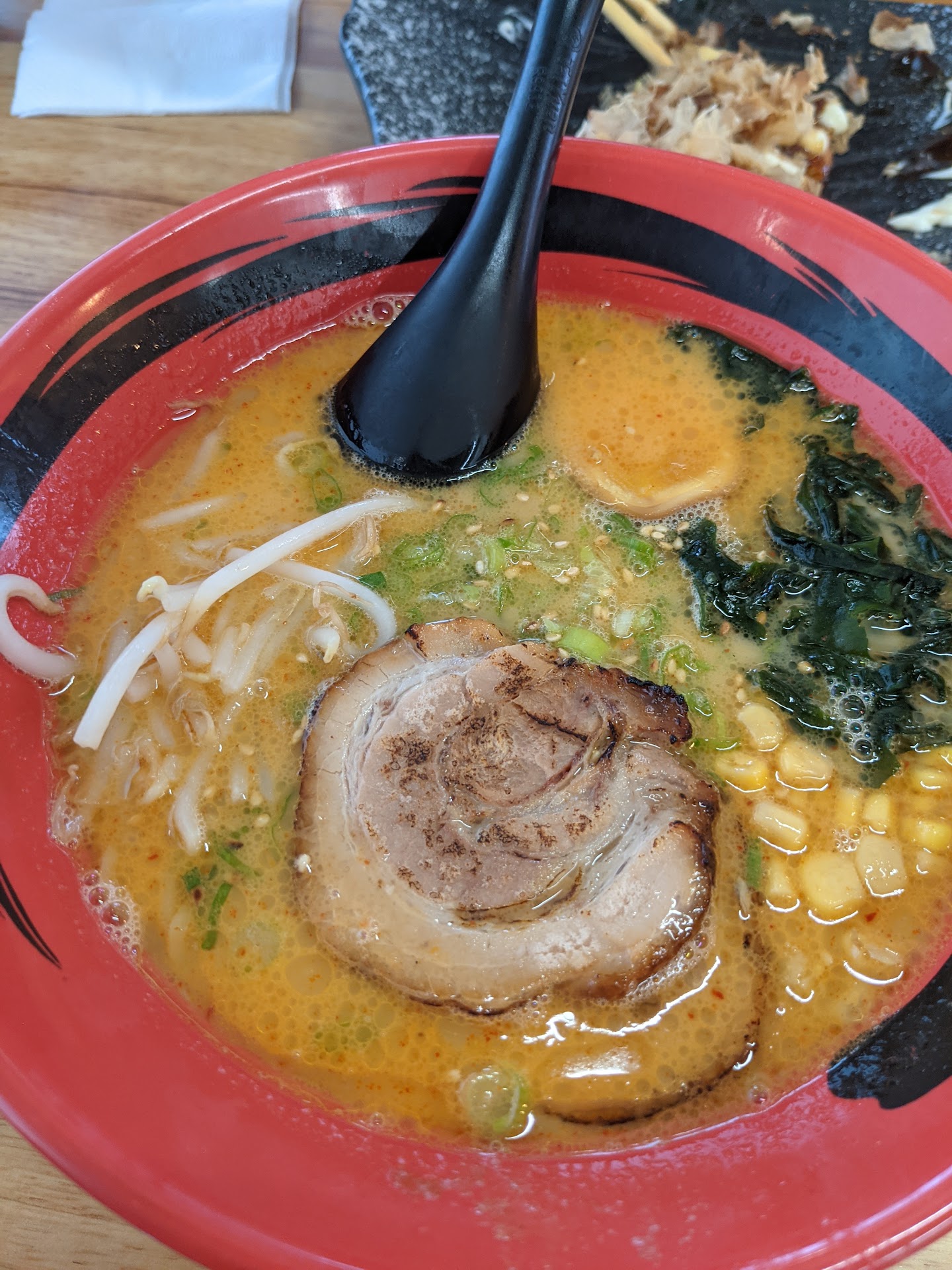 The miso broth (they offer spicy, or not. I chose the not) was flavorful. The noodles were thin (I pulled some up to show you in my image). I prefer thick curly noodles, but these were perfectly cooked and were more than acceptable. And they include half an egg, which many places make you pay for.