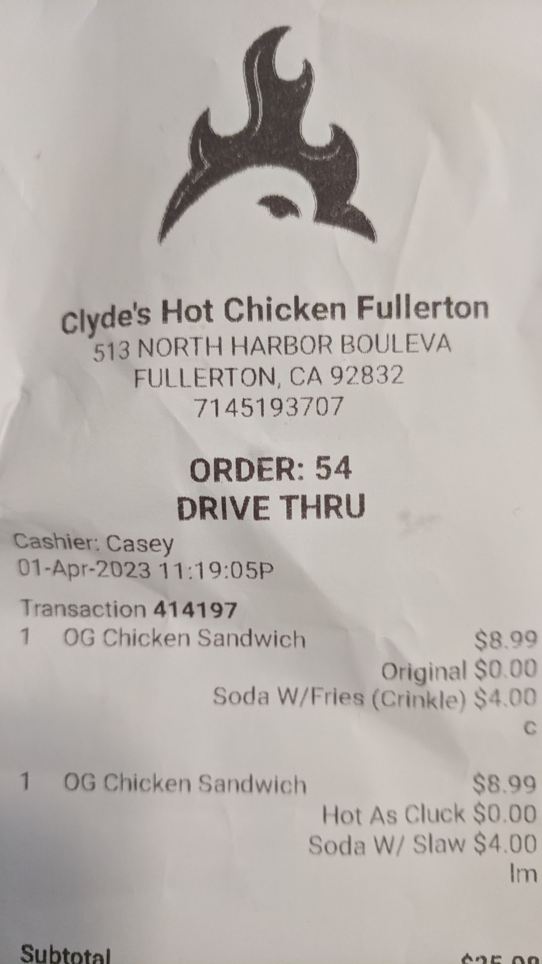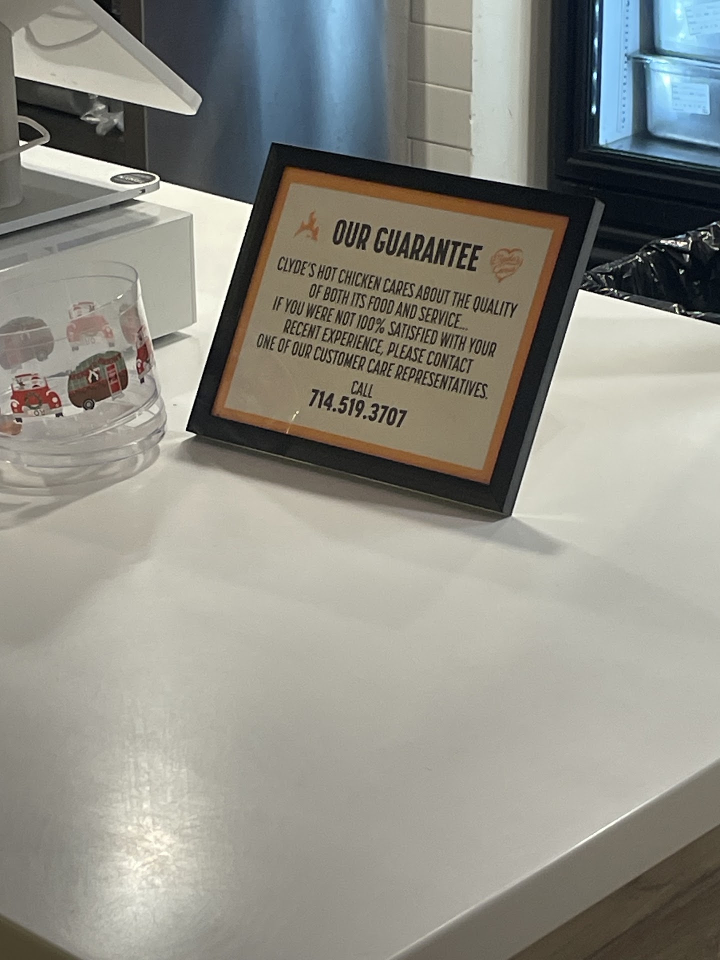 Ā Ā Ā Read moreI'm so irritated that I'm literally writing this review while still sitting in the restaurant. I had high hopes because I'm a hot chicken fan and decided to try a new place since I'm in the area. I ordered for my spouse and I and before we could walk away from the counter a young woman walks from the drive thru register and tells our cashier she accidentally deleted one of the combos from our order and it needed to be refunded and recharged. No greeting no apology she just proceeds to bulldoze the soft spoken male cashier and refund one of the items. Definitely left a nasty taste in my mouth. As someone who not only owns a catering business but has also worked in fast food the customer service was lacking to say the least. The customers before us were called for their order and they proceed to the counter to grab their trays and go sit. They realize that they have my order and offer to hand it to me. THANKS BUT NO THANKS! I walked to another female cashier who was expediting and advised that it'll need to be redone because I mean we are still in the grips of Covid and Monkeypox and that she should be careful with giving orders (food costs are no joke for owner/operators ). She had a complete attitude and said to me "I didn't give it to them they just grabbed it!"... Umm they were called to the counter for 2 orders which were haphazardlydumped on the counter! The customer doesn't work here, you do. It's really sad that a place with good food lost a potential repeat customer due to atrocious customer service. I don't spend my hard earned money where I'm treated...