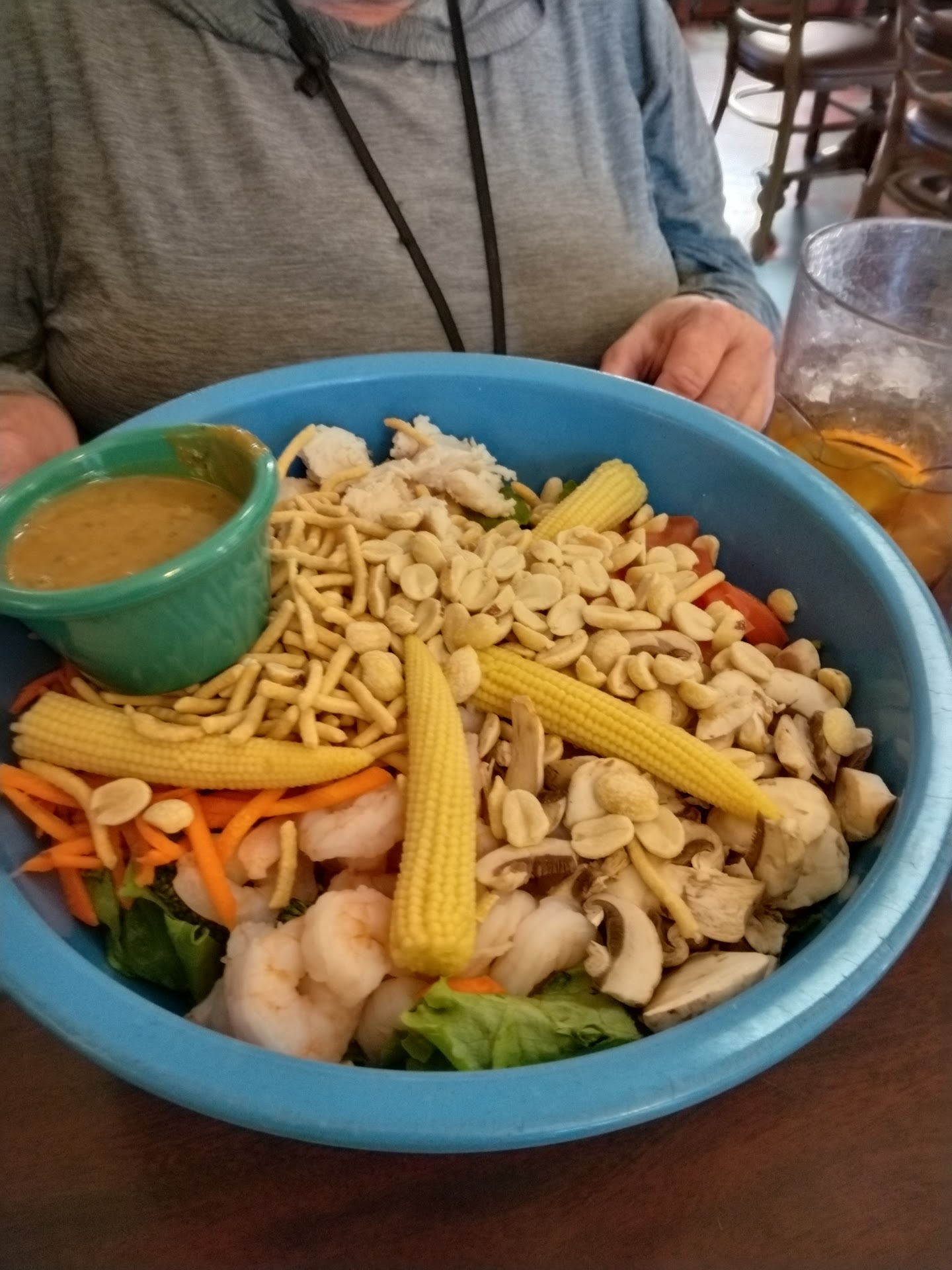 I also enjoyed a Passion Fruit Tea, which was initially unsweetened but came with sweeteners available on the table, allowing me to customize it to my taste. Additionally, the Thai Salad with Chicken and Shrimp was enormous—so much so that a take-home container was necessary! Not to mention the fresh black bean dip, and the exceptionally fresh tortilla strips salted perfectly