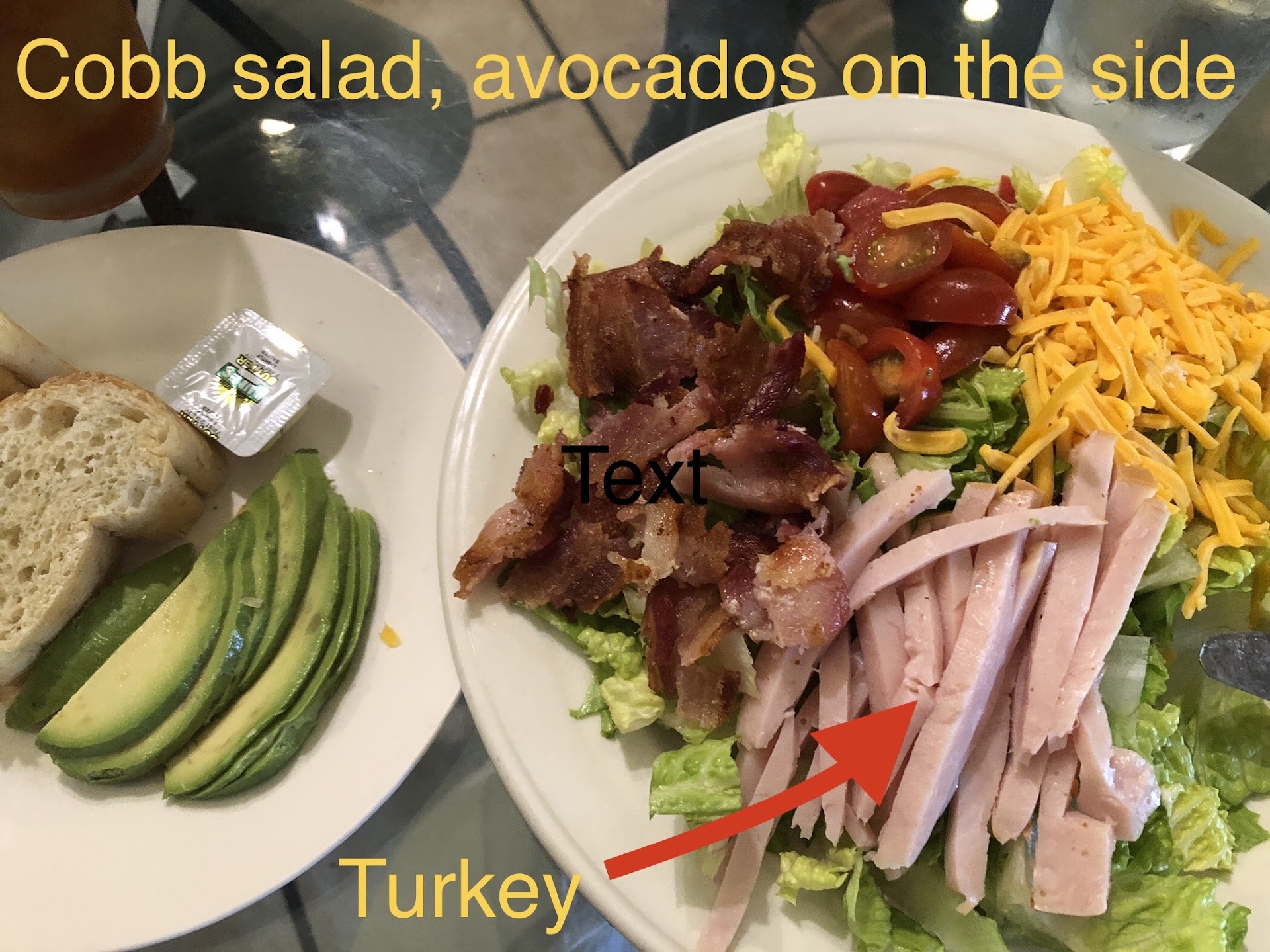 We came for a birthday lunch, and it’s a good thing we had plenty of time to sit and visit, because there was very little in the way of service. We had started with one waitress, got our appetizer order in, and waited. She came back later and took the main order, and then we waited. Then we wound up with a second waitress, with no one telling us they had switched off. This was after I tried to wave anyone down get more water, and finally had to go to the counter to ask for some. The Cobb salad was pretty good. The bacon was plentiful and delicious— likely thick-sliced applewood smoked bacon. The turkey was hardly capable of being detected as being meat. It was hard to tell whether it was ham or what; it almost looked plastic, (pic included). I didn’t eat it; hubby did, when I took it home. The bruschetta bread was light-textured and crisp, with abundant chopped grape tomatoes. Nice sweet balsamic vinegar to top. Stuffed mushrooms were flavorful and nicely textured The lemon bar was the best! Perfect lemoniness, light creamy texture but with a thin crisp crackle crust top edge. The bottom crust was perfectly crisp and buttery. All in all, I suspect they are short-staffed, and the waitresses are tired and overworked. We still tipped them 15%...