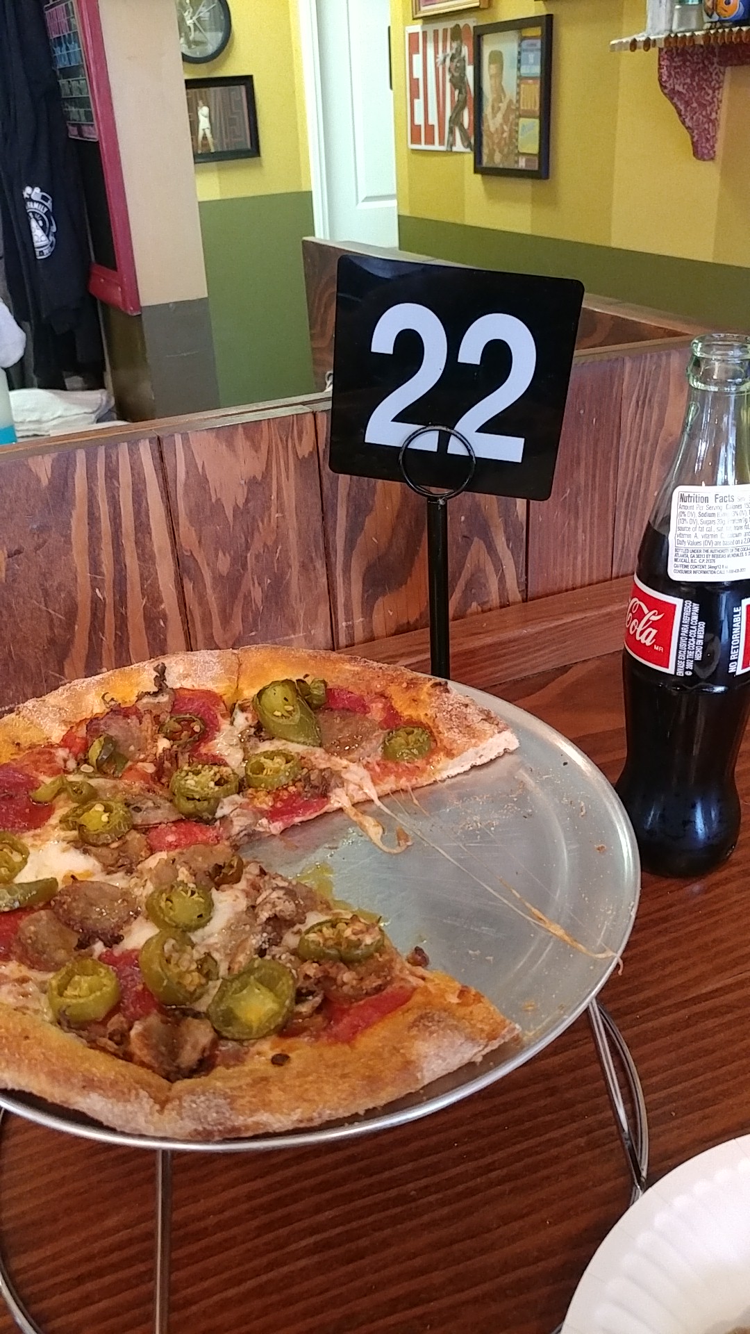 They've got beer on tap, but I decided to go for a bottle of Coke (love the sugar over high fructose corn syrup). After perusing the menu, I decided to try one of their specialties, the Bronx Bomber. It's got pepperoni, sausage, mushrooms, garlic, and jalapeños. It sounded like something I'd enjoy, and the price for the 10" was reasonable.