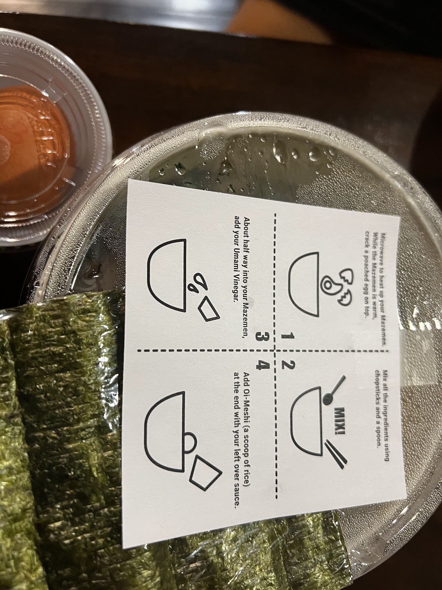 Food So since it was our first time, and they had so many items we decided to try a few different dishes. Had to try the Deluxe Mazeman. Maybe I have never ordered this to go, but it was an awesome experience. There were instructions on the bowl itself on how to get your Mazeman ready to eat. You have to first heat it up, then add the egg they have for you (it’s cooked a bit) and mix everything up. Then you add the vinegar provided, enjoy and add some rice in the end to finish all the ingredients. The squid appetizer and the chicken they have is so good as well.