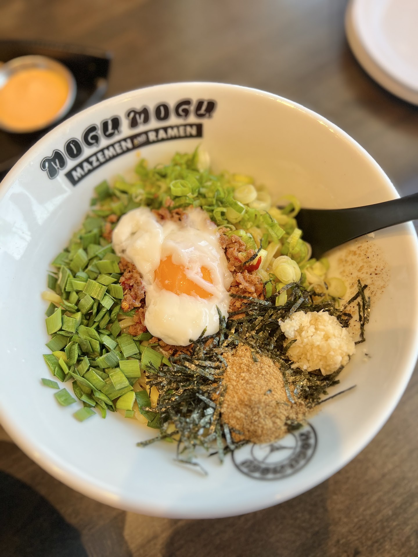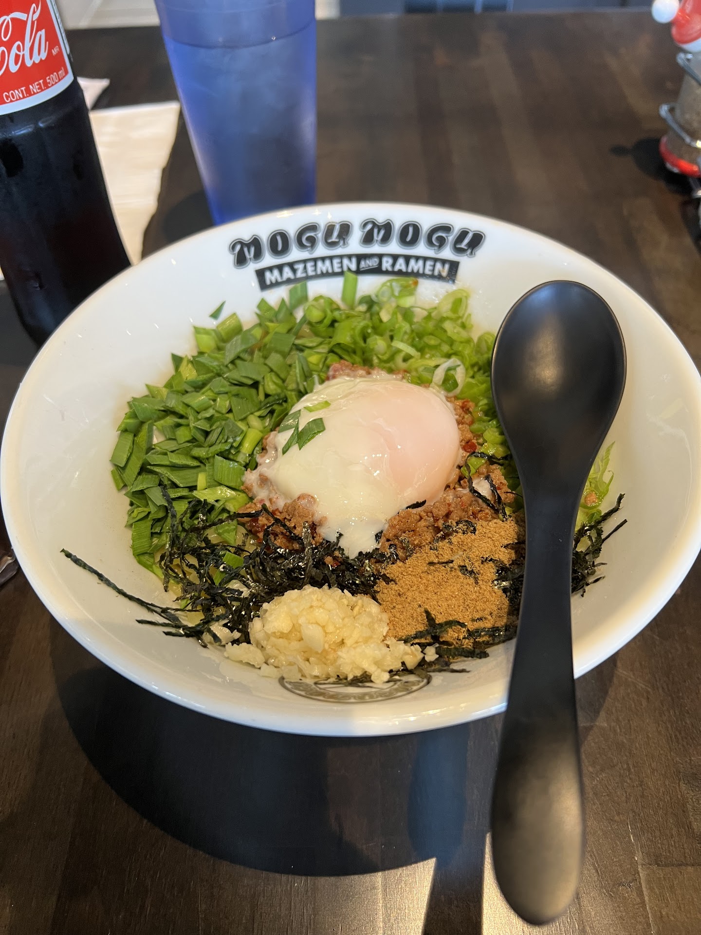 Tokyo Mazemen - My cousin ordered this dish. For those who don’t know, Mazemen is a Japanese, noodle, broth-less dish served with oil and toppings. This specifically contained spicy minced pork, poached egg, scallions, chives, minced garlic, fish umami, seaweed flakes. They also had instructions on how to properly eat Mazemen on their menus and walls. They later brought a tiny bowl of rice. My cousin loved this dish! It wasn’t too salty, and everything paired well together.