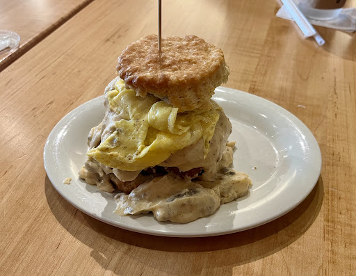 The Five & Dime was a show stopping biscuit sandwich, absolutely towering with eggs, bacon, cheddar, and smothered in the gravy. It was great but definitely a fork and knife ordeal. Overall super delicious, but maybe a little big for one person.