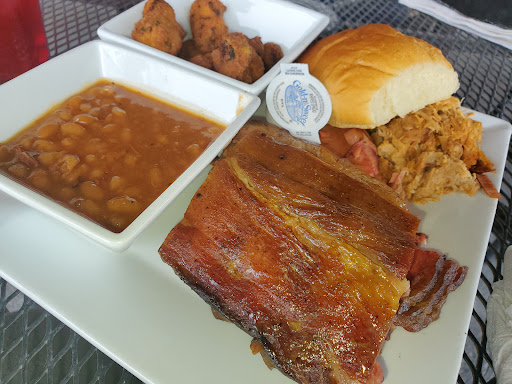 Read moreServer was absolutely phenomenal! Food was bland and unseasoned. We ordered the Phat Boy Platter (I believe that's what it was called) with ribs, brisket, and pulled pork. All were smoked well (gave the ribs the bone-pull test, they all came out like butter!) but the flavor wasn't there and the brisket was dry. Look at the ribs; where's the bark? Tried to douse the meat in bbq sauce; they only offer one kind of sauce (umm, never have I ever been to a bbq restaurant with only 1 kind of sauce, I'm still confused) which was super sweet and had no dimension (no heat, no spices, nothing acidic, just sugar!). The baked beans were the best thing on our plate and the fried okra could have been ok had they hit it with a dash of salt when it came out of the fryer. They didn't seem to offer any elevated or even exciting cuts of meat in the freezers on the retail side and don't serve burnt ends in the restaurant (again, never been to a bbq place that didn't serve burnt ends - like, not on the menu at all?!?!).The rolls that we were served were dry and stale and fell apart when I tried to cut it in half. I'm not even a fan of Bandana's but they're 100,000,001 times better. Perhaps they were having an off day and perhaps we'll return on a different day to see if this was the case. Again, the service was top-notch and the waitress was...
