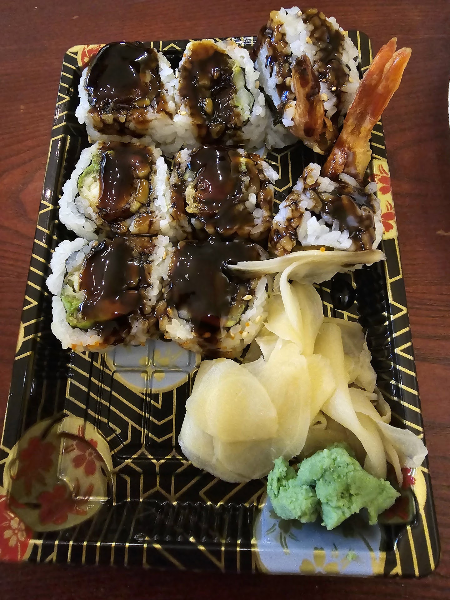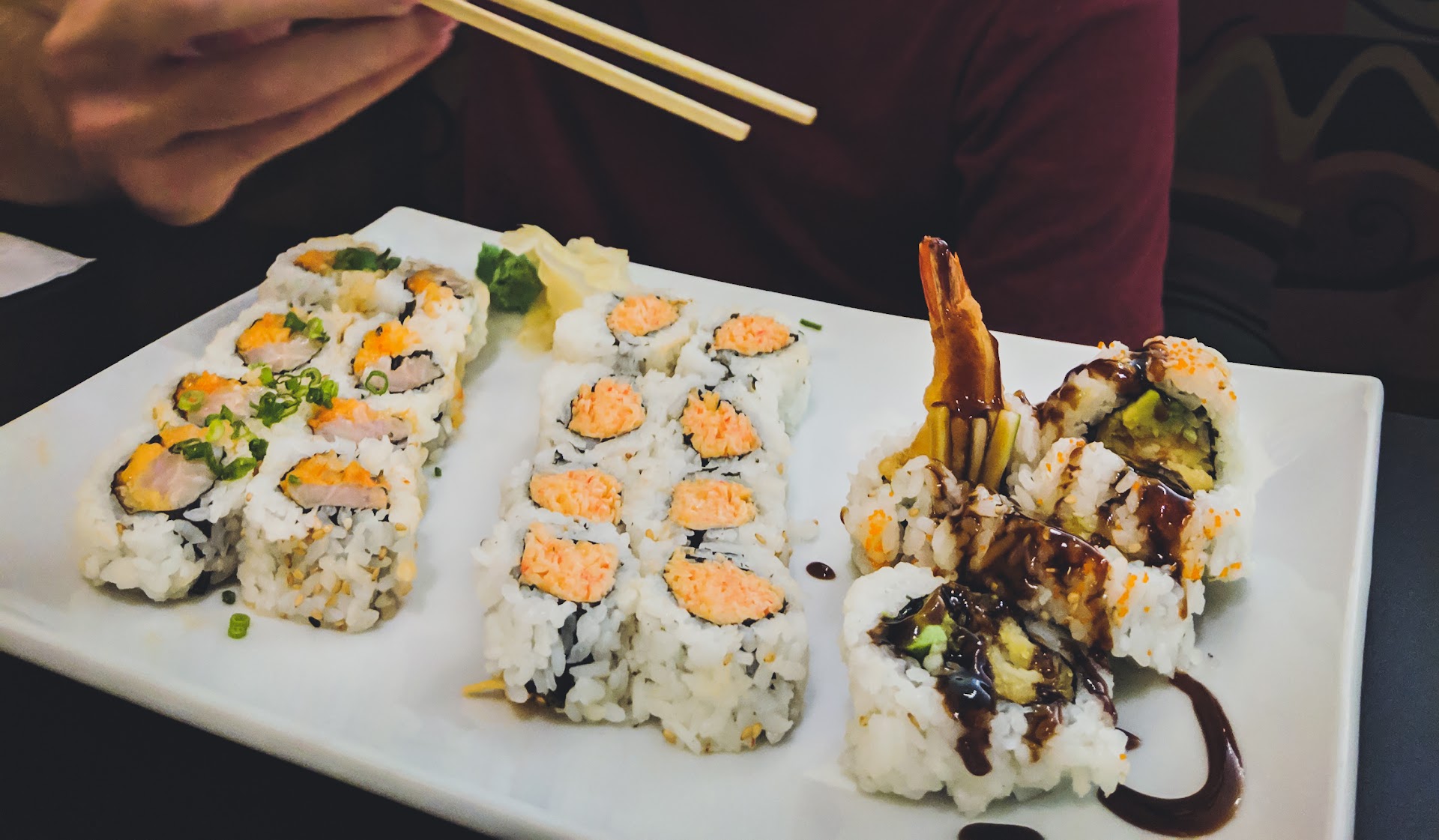 Our sushi came and it looked great. My boyfriend and I share so we liked that it came arranged on one large plate. Our sushi was fresh and tasted just like the fancier looking sushi places. The rolls were smaller sized, which I liked because I could comfortably fit them in my mouth, and you got more pieces to make up for the size. They were expertly wrapped and didn't fall apart.