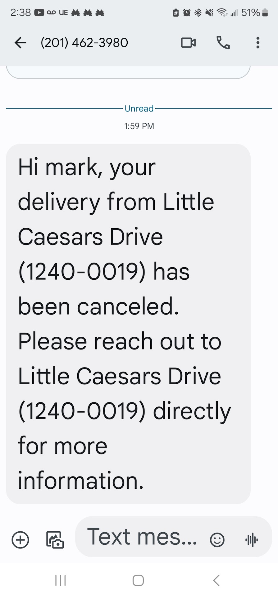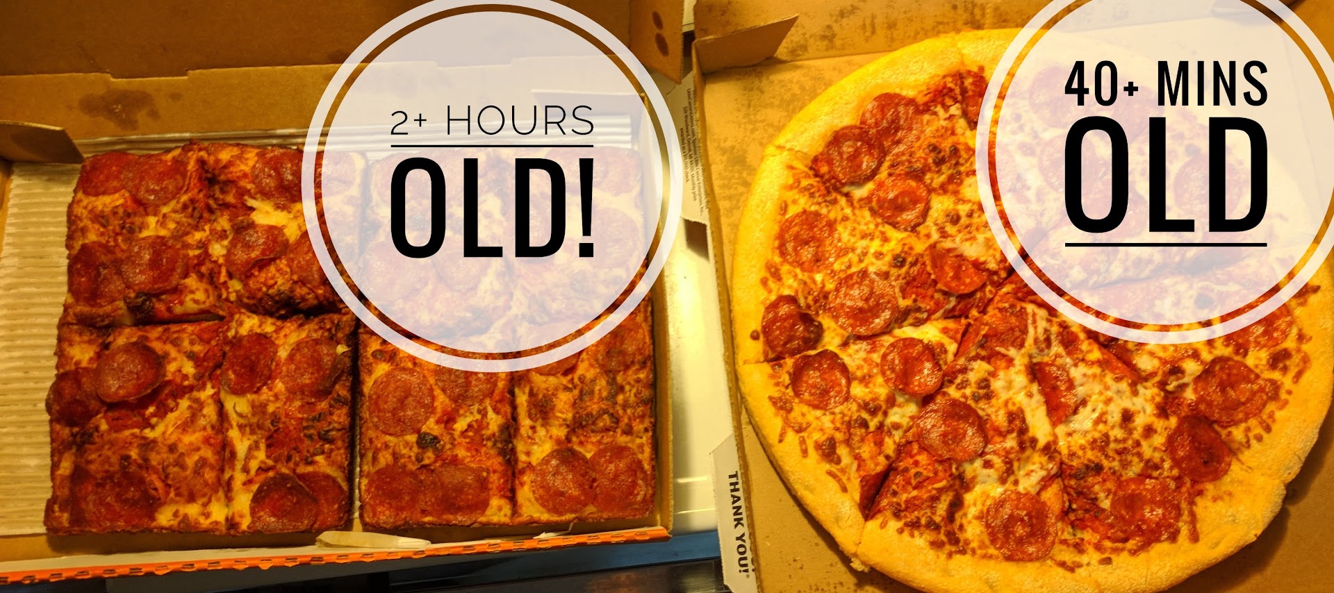 Finally a young woman comes to the counter and presents me with two cold pizzas and boxes felt wet.