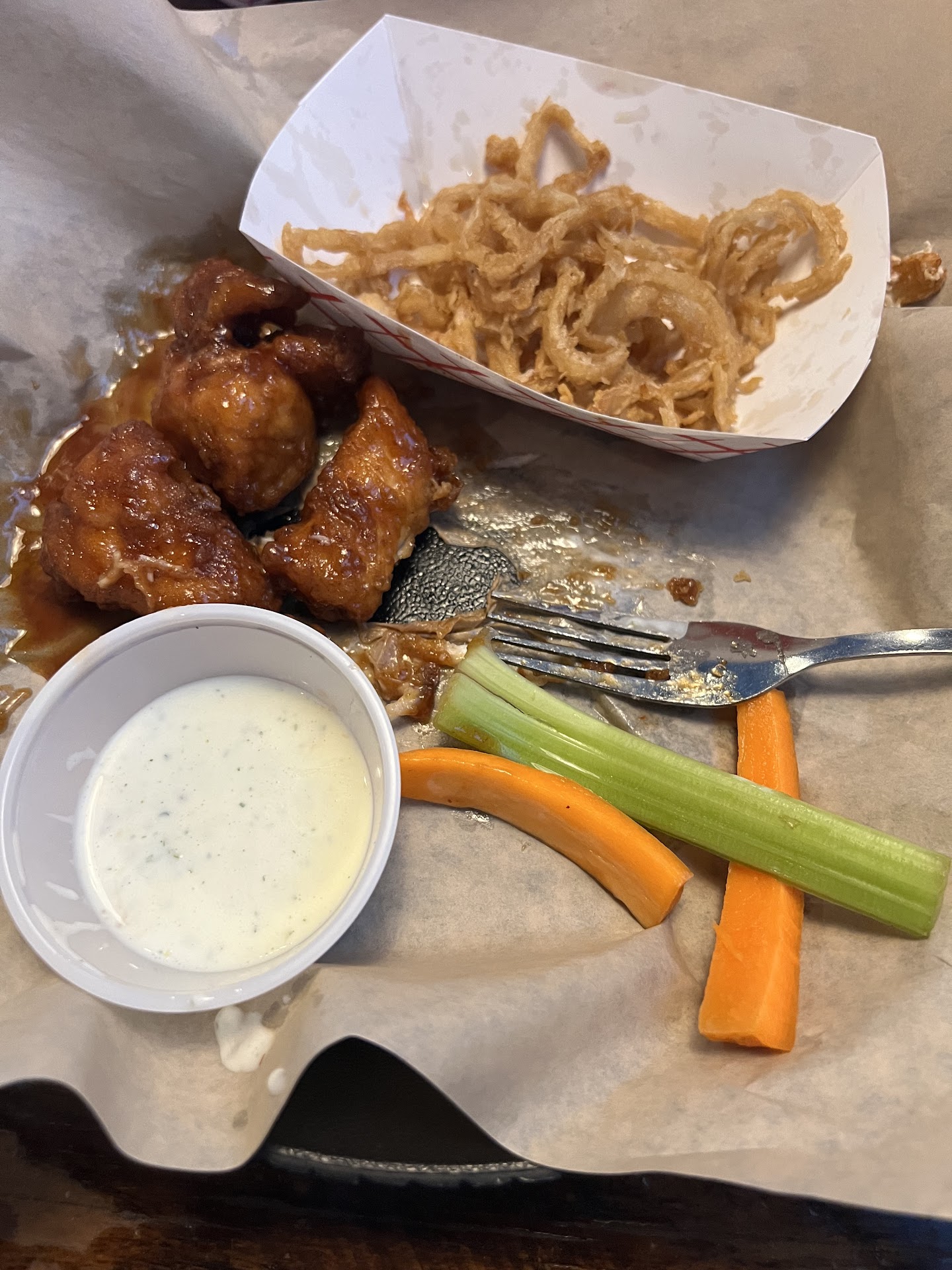 Read moreI'm embarrassed to say we've lived in Fuquay Varina for several years now and have not gone on an explore for a decent wing place. On our local radar has been Wingin'it Bar and Grille so this evenings' dinner location was set. Our first time here, we entered the door for the bar so if you're here just for dinner, go down a few doors and enter. We're kind of early birds so we were quickly seated at the 5pm dinner hour. Our server, Brianna, was helpful in discussing the options, and kindly left the menu with us after ordering so we could view all the offerings. (Too many places literally rip the menu out of your hand after ordering...stop that!) Our appetite is not real adventurous so we both went for the boneless chicken wings with honey bbq and a side of onion straws. I don't think many places can match this restaurant for speed. Our dinners arrived so quickly. And I'm happy to report the chicken was terrific. So tender, succulent, with just the right outside crunch. Generous sides of sauce, ranch, and carrots and celery were perfect. We're going to say bye bye to the local fast food chicken places. The prices here were what I expected; labor, food, rent, supplies are all higher now. But, the prices here are not much more than what one would spend at the fast food places. However, in my opinion, the food tastes so much better here. If you come here, I believe you'll agree that you get good value for your hard earned bucks. You won't break the bank! Thanks owner(s), chef, and Brianna....